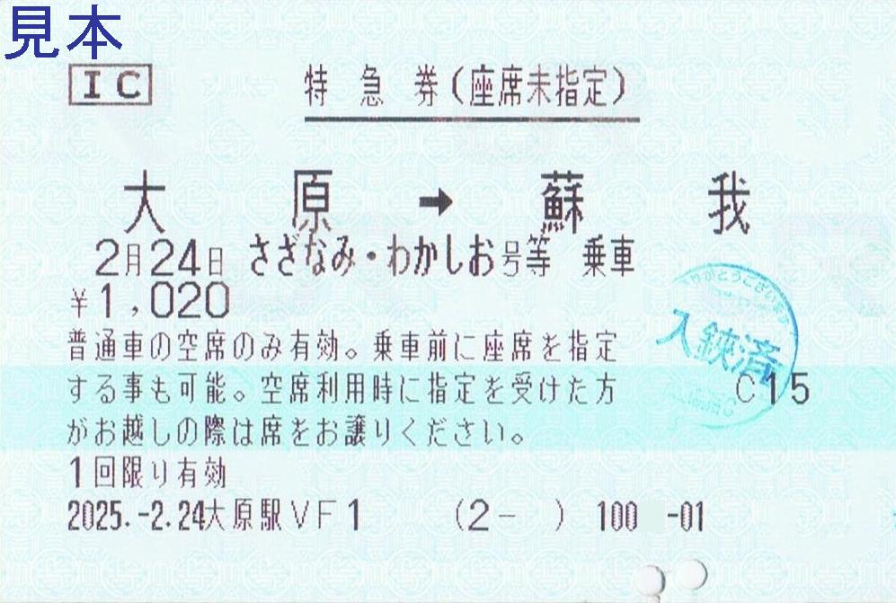 《大原駅VF1発行 特急券(座席未指定)さざなみ・わかしお号等乗車(2025(令和7)年2月24日)》
