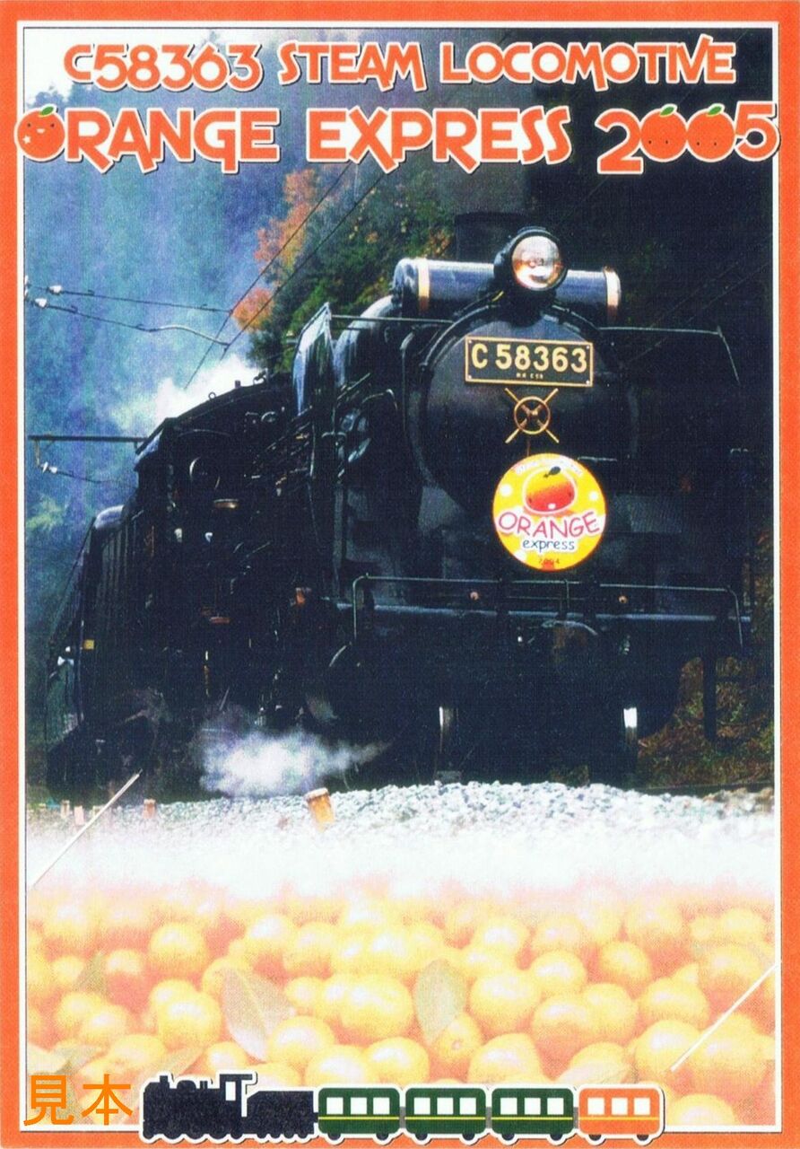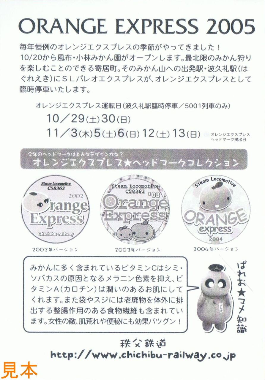 平成17年10月29・30日、11月3・5・6・12・13日のパレオエクスプレスは『オレンジエクスプレス』として運行され、5001列車が寄居町にあるみかん山の最寄駅である波久礼駅に臨時停車しました。オレンジエクスプレス運行時期には、駅で販売されていたパレオエクスプレス運行記念入場券(D型硬券)に写真の台紙(左は表面、右は裏面)を付けて販売していました。裏面には過去のオレンジエクスプレスのヘッドマークとみかんの栄養に関する説明が記載されています。