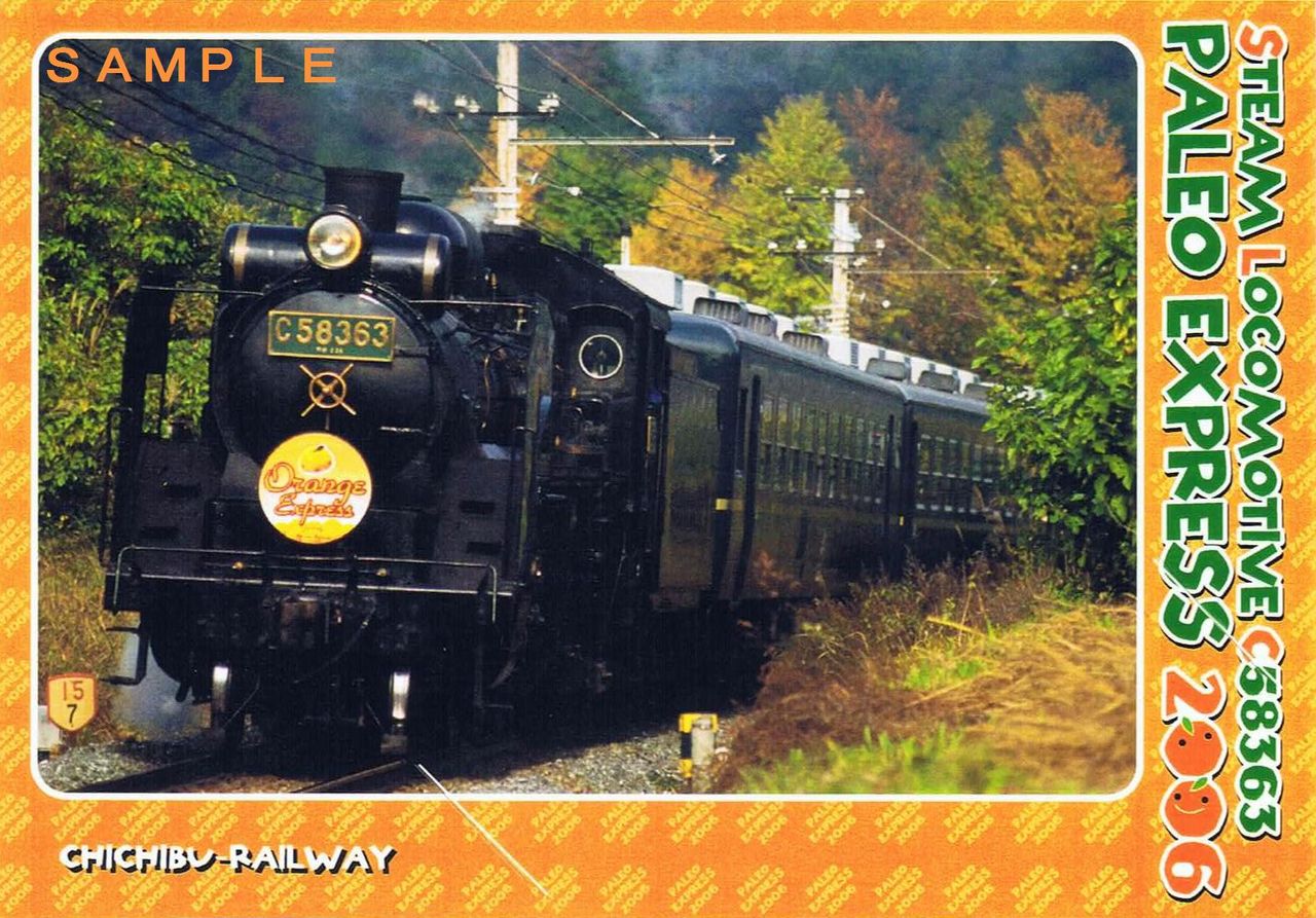 平成17年10月29・30日、11月3・5・6・12・13日のパレオエクスプレスは『オレンジエクスプレス』として運行され、5001列車が寄居町にあるみかん山の最寄駅である波久礼駅に臨時停車しました。オレンジエクスプレス運行時期には、駅で販売されていたパレオエクスプレス運行記念入場券(D型硬券)に写真の台紙(左は表面、右は裏面)を付けて販売していました。裏面には過去のオレンジエクスプレスのヘッドマークとみかんの栄養に関する説明が記載されています。《オレンジエクスプレス記念入場券台紙(2006(平成18)年10〜11月)》