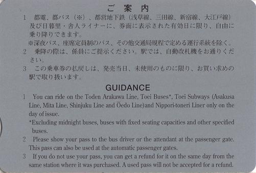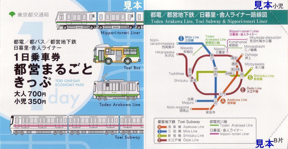 長い間、若干の変化がありながらも、表紙写真はずっと同じだった東京都交通局の1日乗車券が日暮里・舎人ライナー開業により『都営まるごときっぷ』と商品名が変わりました。表紙が変わり、文と路線図に日暮里・舎人ライナーが入りました。写真は平成20年3月30日に日暮里駅で購入したもの。駅名は補充で、小児専用券は無し。
