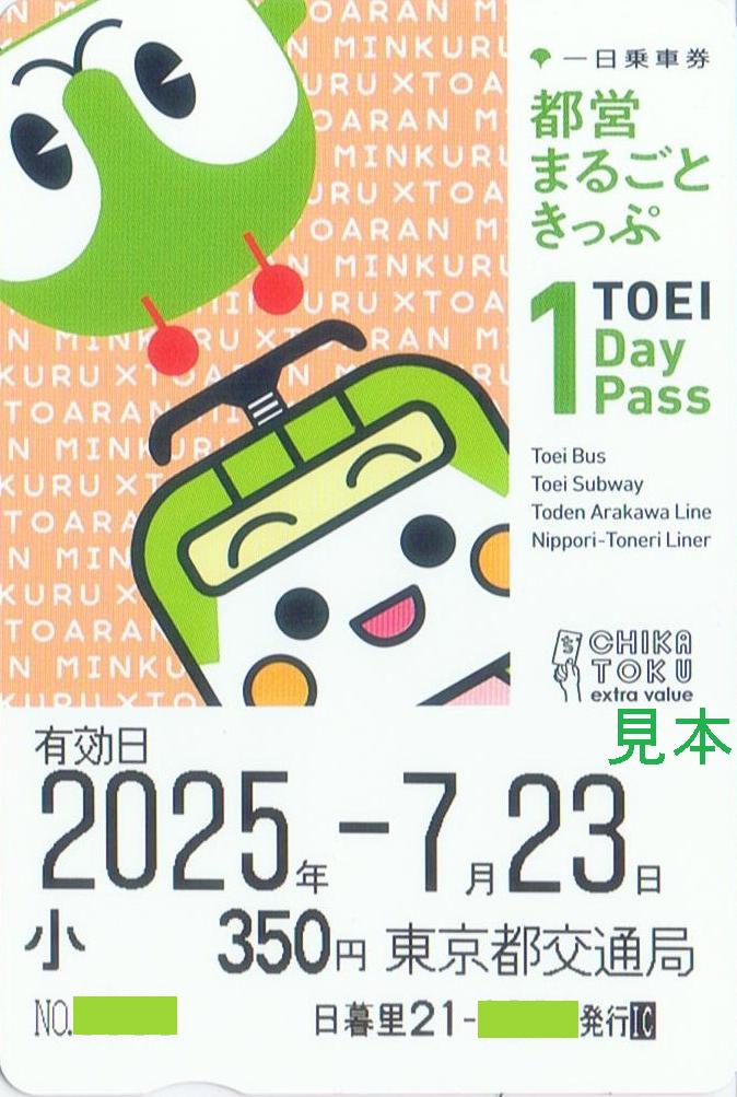 2025年3月22日〜4月6日に開催された都営交通初のキャラクターが主役のキャンペーンにあわせて発売された限定デザインの都営まるごときっぷ。デザインはみんくる、とあらん単体とみんくる&とあらんの計3種類。各種7,000枚限定。イベント終了からかなり経過した同年7月23日時点で日暮里・舎人ライナー日暮里駅にてみんくる&とあらんデザインのみ発売中。――――――――――――――――――――――――――――――――――――――