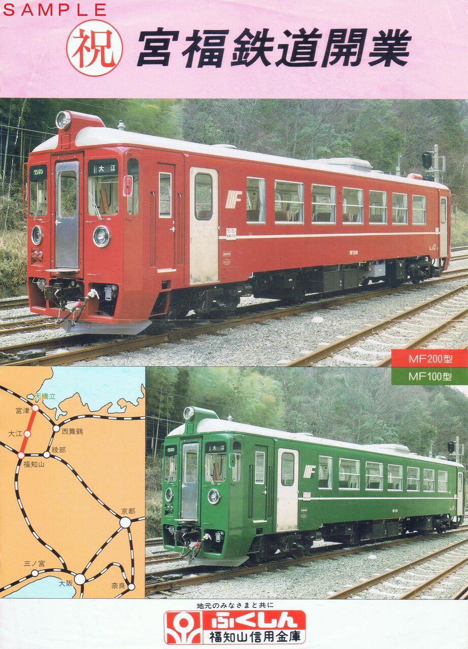 日本鉄道建設公団AB線として建設されていた宮福線を運営する第三セクター・宮福鉄道株式会社は1982(昭和57)年に設立。宮福線は1988(昭和63)年7月16日に開業しました。後に特定地方交通線だったJR西日本宮津線を同社が継承することとなり北近畿タンゴ鉄道株式会社に商号変更。第1種鉄道事業者から第3種鉄道事業者へと変わり、宮福線は第2種鉄道事業者であるWILLER TRAINS(京都丹後鉄道)の運営へと変わりました。写真は宮福鉄道宮福線開業を記念した福知山信用金庫の預金募集のチラシ(A4サイズ)です。福知山信用金庫は後に合併により京都北都信用金庫となりました。同金庫は北近畿タンゴ鉄道の株主です。