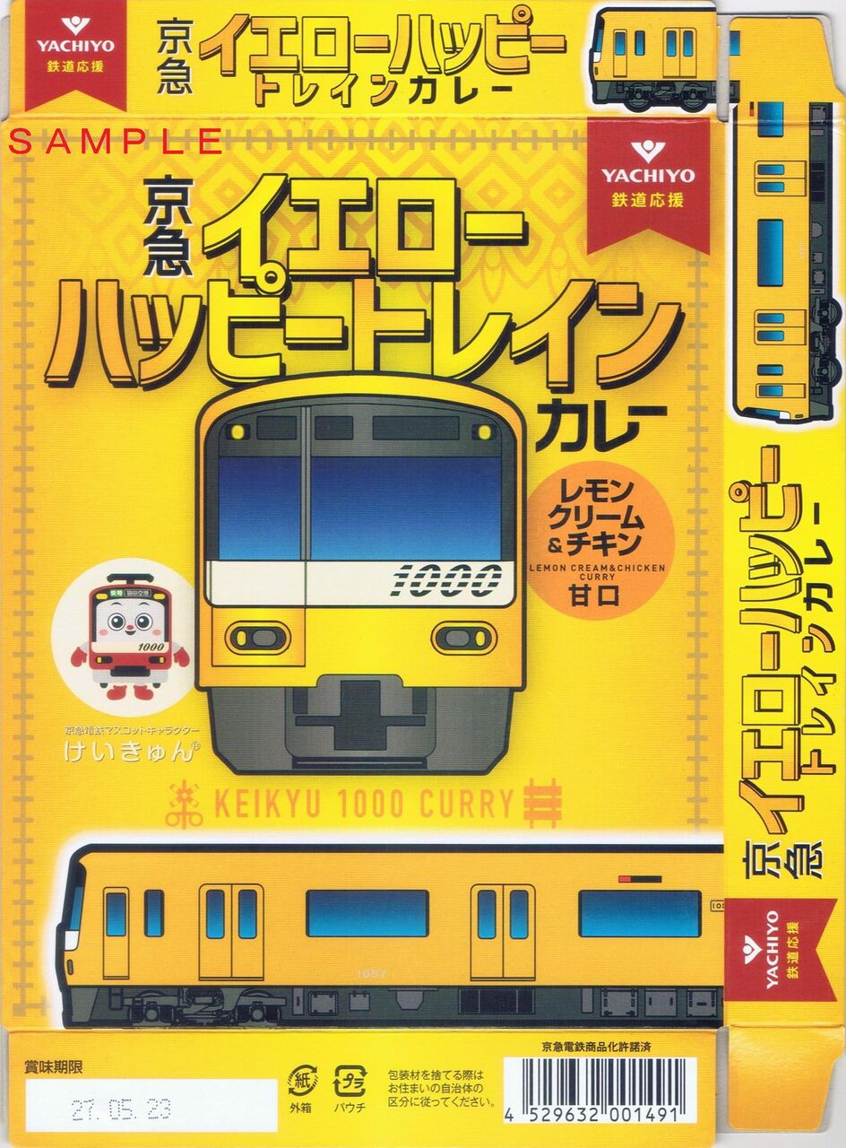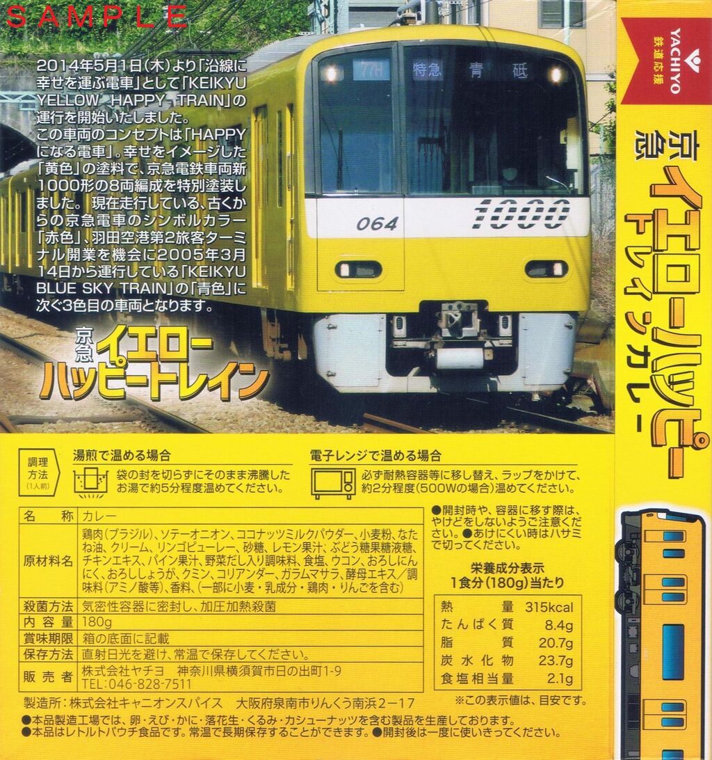 製造元は株式会社キャニオンスパイス。販売者は株式会社ヤチヨのKEIKYU YELLOW HAPPY TRAINをイメージしたパッケージのレモンクリーム&チキンの甘口レトルトカレー。税込648円。写真はパッケージの表面と裏面。表面デザインはイラスト。裏面は実車の写真(特急青砥行)と解説。発売箇所はセブンイレブン京急ST。他に京急グッズオンラインショップ『おとどけいきゅう』でも取り扱いあり。このシリーズは全3種類ありますが私が購入したセブンイレブン京急ST上大岡では残り1個でした。ルーは実車のイメージ通りの黄色いもの。甘口ですが程よいレモンの酸味で美味しいカレーでした。【関連記事】