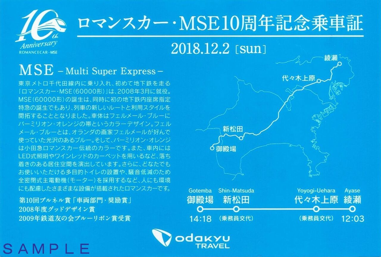 《ロマンスカー・MSE10周年記念乗車証(ポストカードサイズ)》
