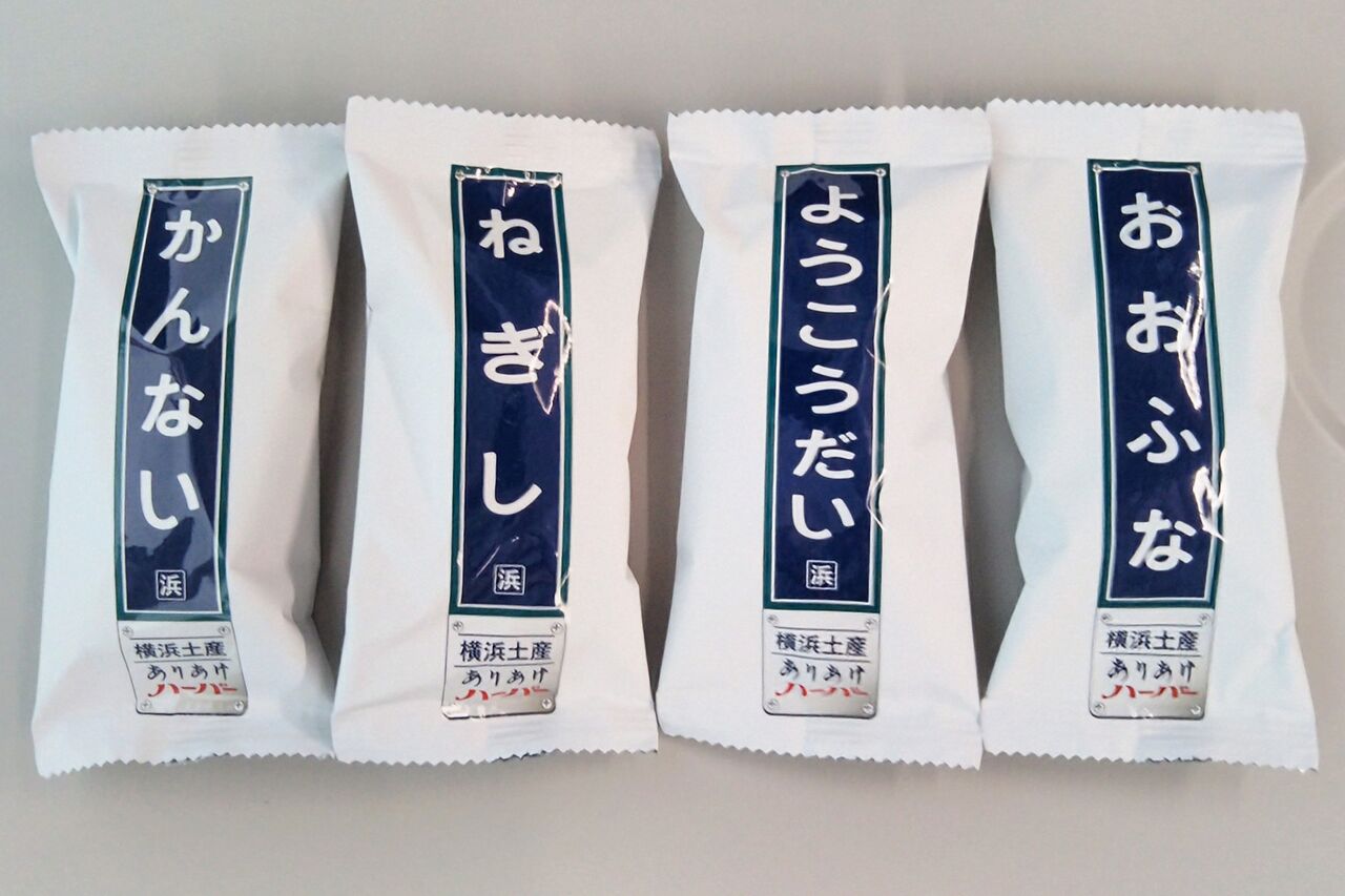 横濱ハーバーの個包装はホーロー駅名標(レプリカ)デザインとなっていました。個包装デザインの駅はランダムの様で、メーカーホームページには選べない旨の記載あり。私は関内駅、根岸駅、洋光台駅、大船駅の4種類で、関内駅分が2個、その他の駅が1個ずつ入っていました。