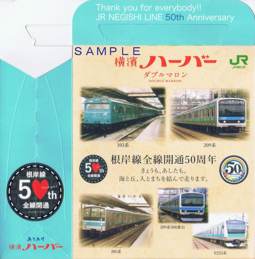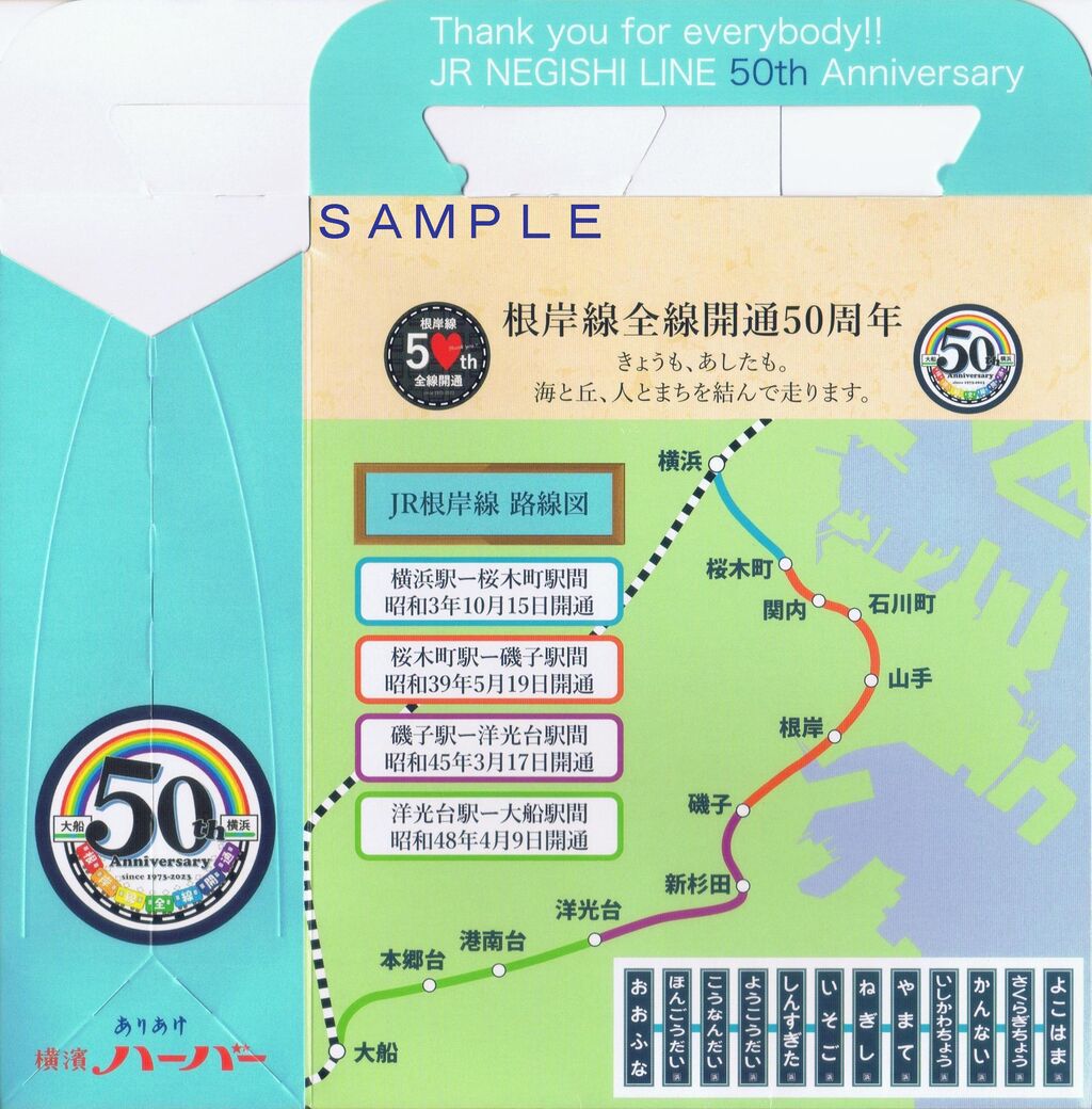 根岸線沿線のNEWDAYS及びありあけ直営店で販売されていた根岸線全線開通50周年を記念したありあけのお菓子『横濱ハーバー』5個入の限定パッケージ版で1セット・税込1,080円。4,000セット限定。パッケージの表面は103系からE233系までの根岸線を走った車両の写真をデザイン。裏面は路線図と開通年月日、50周年記念ヘッドマーク(2023年7〜10月に京浜東北線・根岸線で運行された『根岸線全線開通50周年記念オリジナルヘッドマークを掲出した電車』の横浜・大宮寄り10号車及び大船寄り1号車)、各駅のホーロー駅名標をデザインしています。