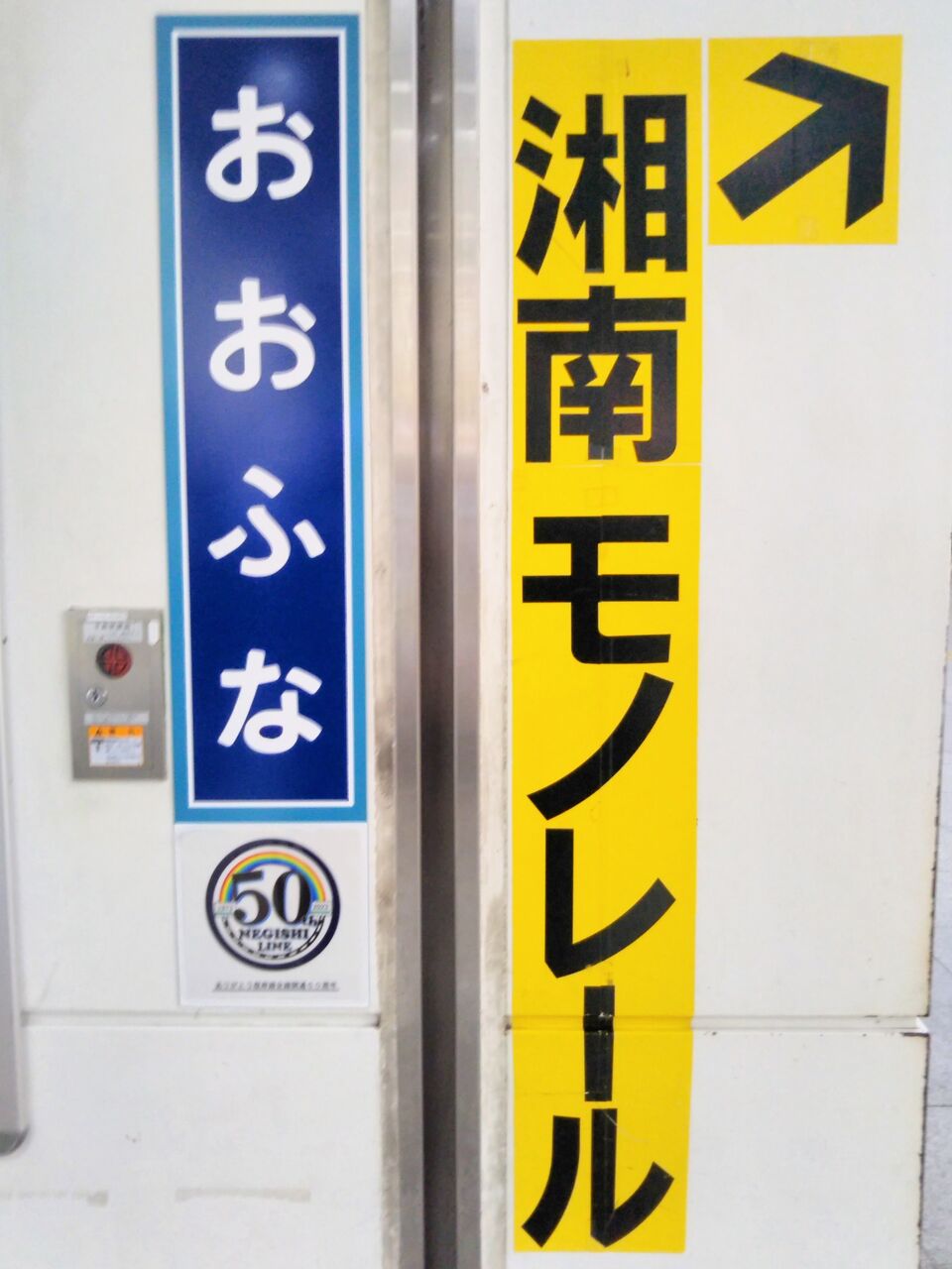 同駅に掲出されていた全線開業50周年関連のホーロー駅名標(レプリカ)と記念ポスター。
