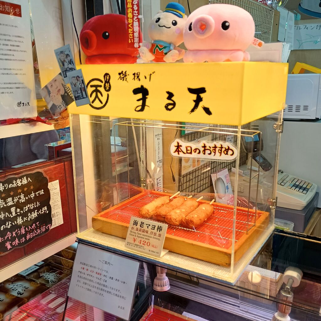 伊勢志摩の名産品ですが、道の駅伊東マリンタウン店は同駅内のテイクアウト店舗では人気があると思います。写真左は静岡県内各店共通と思われる『まる天』のパンフレット。写真右は道の駅伊東マリンタウン店で撮影。