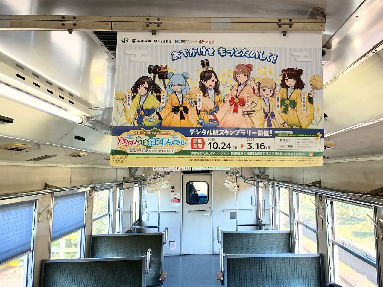 出雲号の車内。小湊鉄道ではJR東日本、いすみ鉄道、千葉都市モノレールと共同で株式会社モバイルファクトリーが配信する位置情報連動型ゲーム『ステーションメモリーズ!』(『駅メモ!』)シリーズとのコラボレーションイベントも並行して実施しています。小湊鉄道では今回もJR東日本と同様にヘッドマークの装着は無く、中吊りの掲出を実施。キハ200形だけでなく、キハ40形にも掲出されていました。