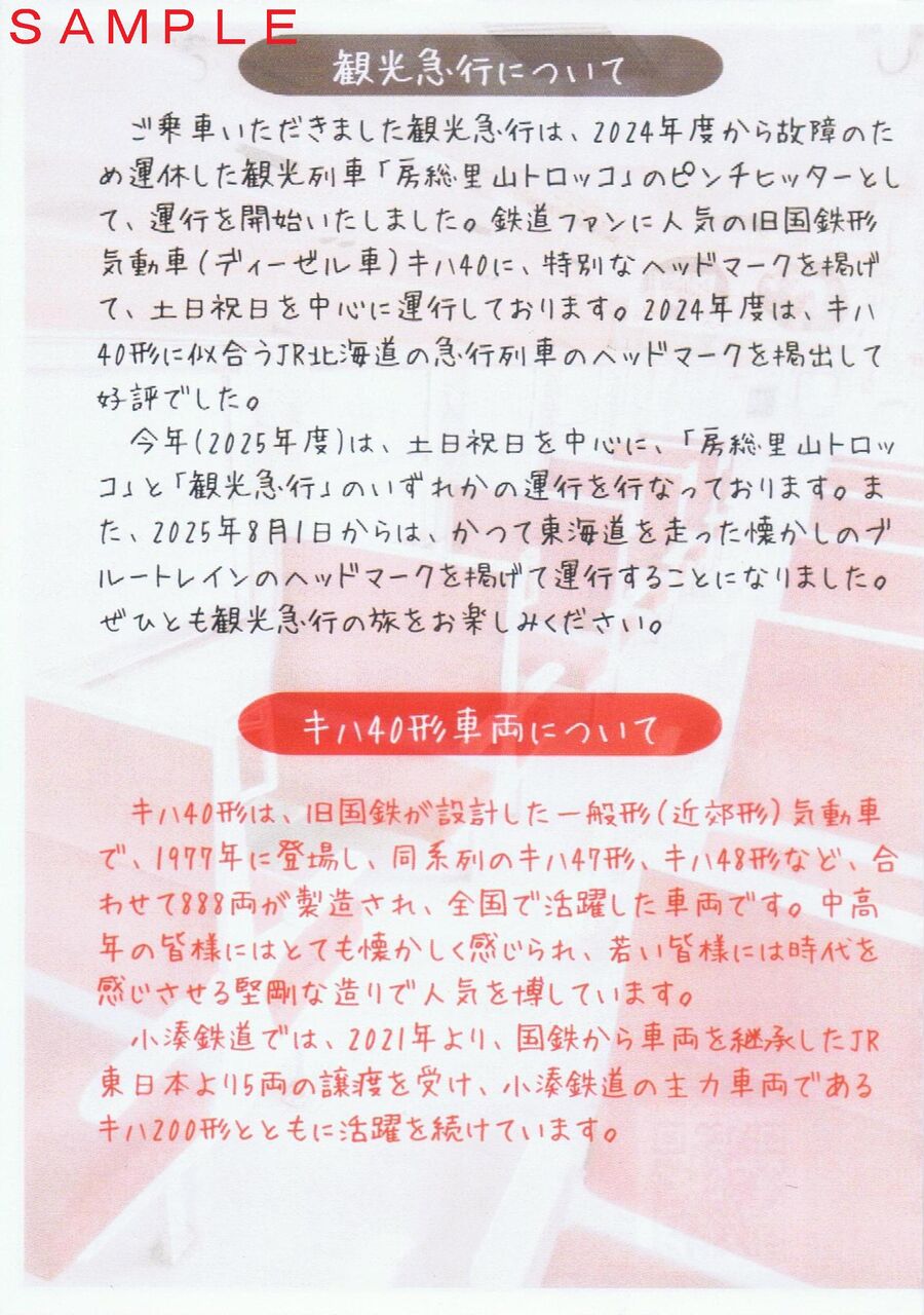 写真左・右は2・3頁目です。観光急行・キハ40形車両・ブルートレインに関する説明が記載されており、コラボ期間中に限定した乗車証明書と思われます。以前、観光急行列車で配布されていたA型硬券の記念座席指定券の配布はありませんでした。