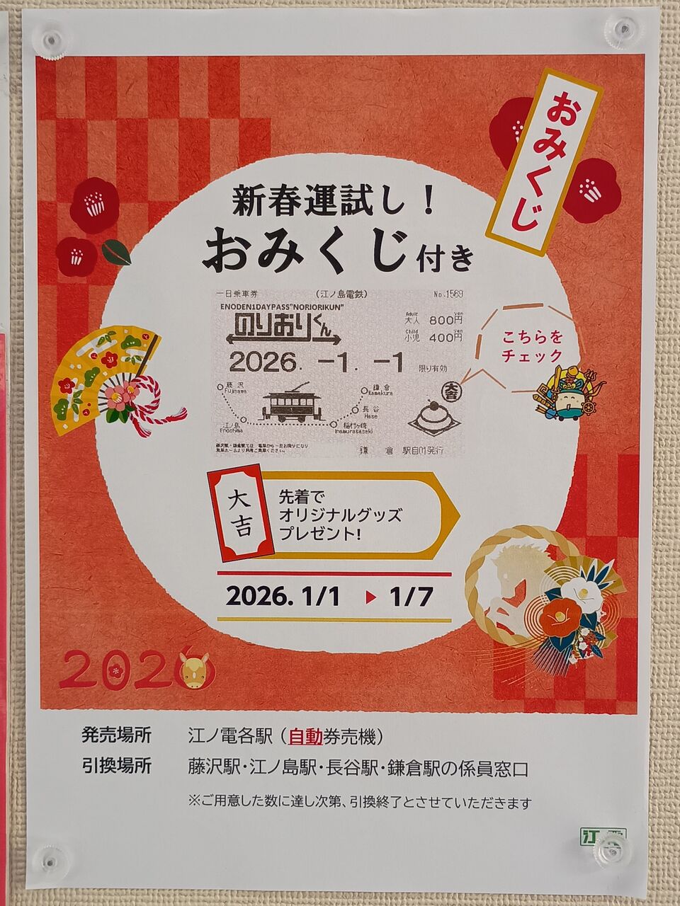 鎌倉駅改札外に掲出されたポスター。干支入場券については2日昼過ぎで既に江ノ島駅発売分が完売で、藤沢駅、江ノ島駅のポスターともにマジックで同駅部分が消された状態になっていました。写真右は新春運試し!おみくじ付きのりおりくんのポスター。