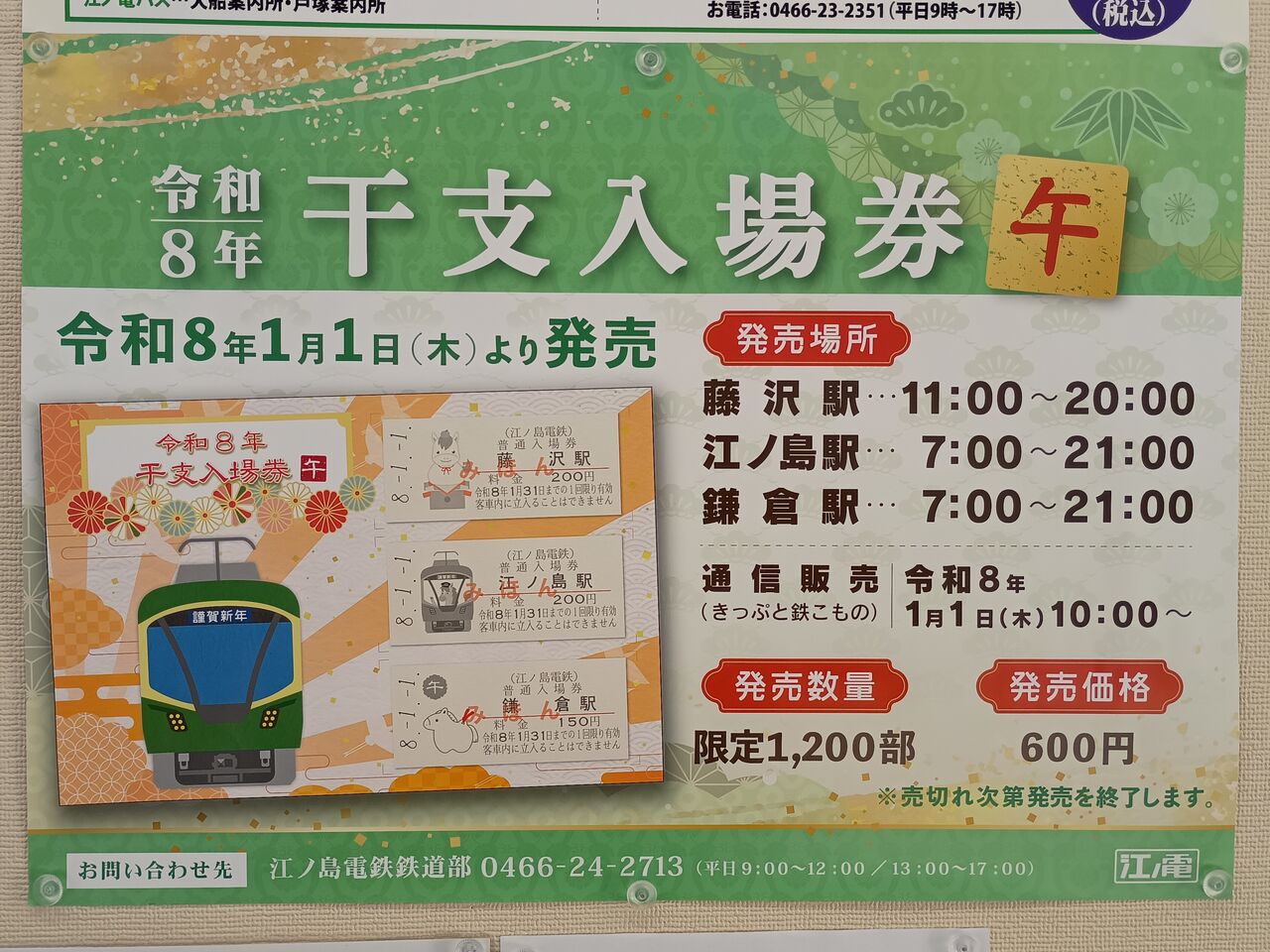 鎌倉駅改札外に掲出されたポスター。干支入場券については2日昼過ぎで既に江ノ島駅発売分が完売で、藤沢駅、江ノ島駅のポスターともにマジックで同駅部分が消された状態になっていました。写真右は新春運試し!おみくじ付きのりおりくんのポスター。【関連記事】