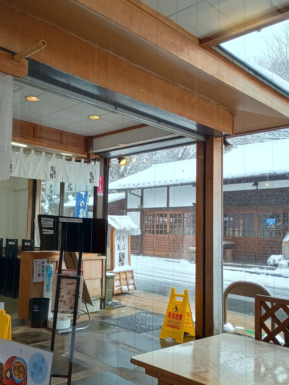 高尾山口駅周辺のそば店では店内が広く・明るくて落ち着く点が良いところ。この日は前日からの雪でしたが、同駅周辺には意外にも冬そばキャンペーン参加者、重装備の登山者、そして薄着の外国人観光客がいました。