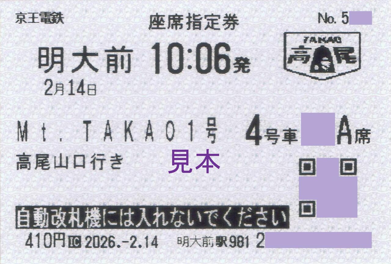 【高尾山冬そば号の座席指定券(2026年2月14日)】