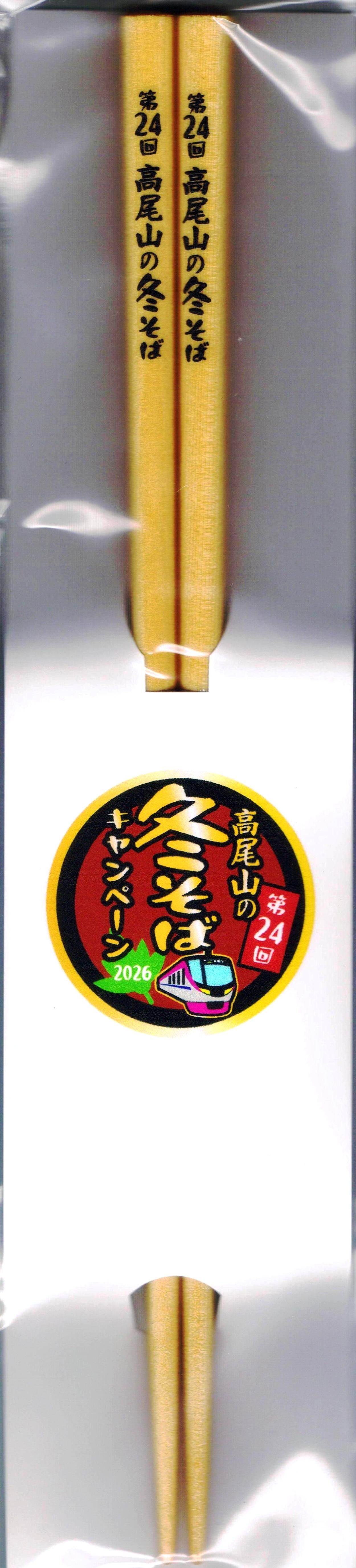 台紙にはピンバッジと同デザインのロゴが印刷済みです。実は5000系の高尾山冬そば号は2024・2025年とも仕事と被っており乗車できませんでしたので、マイ箸の収集は都営新宿線から直通していた臨時急行時代以来となります。停車駅が少ない全席座席指定列車内での配布であるため、全く混乱することがありませんでした。妻は臨時急行時代の車内等の様子をよく覚えていて『あの時は鉄道マニアの「プレゼントくれ!!」というオーラがにじみ出て殺気だつ感じが凄く嫌だった。途中駅で突然ホームに降りて猛ダッシュする人がいっぱいいるし(※プレゼントを複数貰おうということだろう)、高尾山口に着いてからの行列(※プレゼント交換のため)も嫌だった。通勤電車でプレゼント配布はやめて正解』と言っていました。臨時列車のマイ箸が無くなった当時はつまらないと思っていましたが、年を重ねると今回の配布方法が最も落ち着きながら乗車もできるので絶対に良いと感じる様になりました。