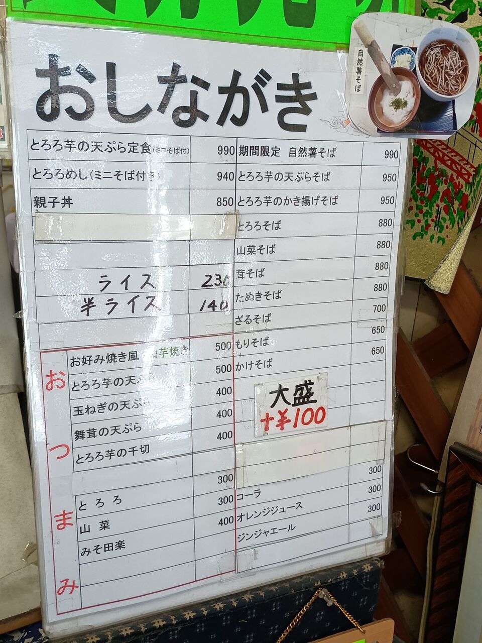 2016年訪問時にみられた天狗の耳たぶそば(※下記リンク記事『高尾山冬そば号(高尾山トレイン)』に掲載)は終売となっており、現在の主力商品は自然薯そば(写真のそばは『冷』で税込1,380円+温泉たまご・税込150円をトッピングしたもの)です。高尾山冬そばキャンペーンチラシの割引クーポンで100円引となります。