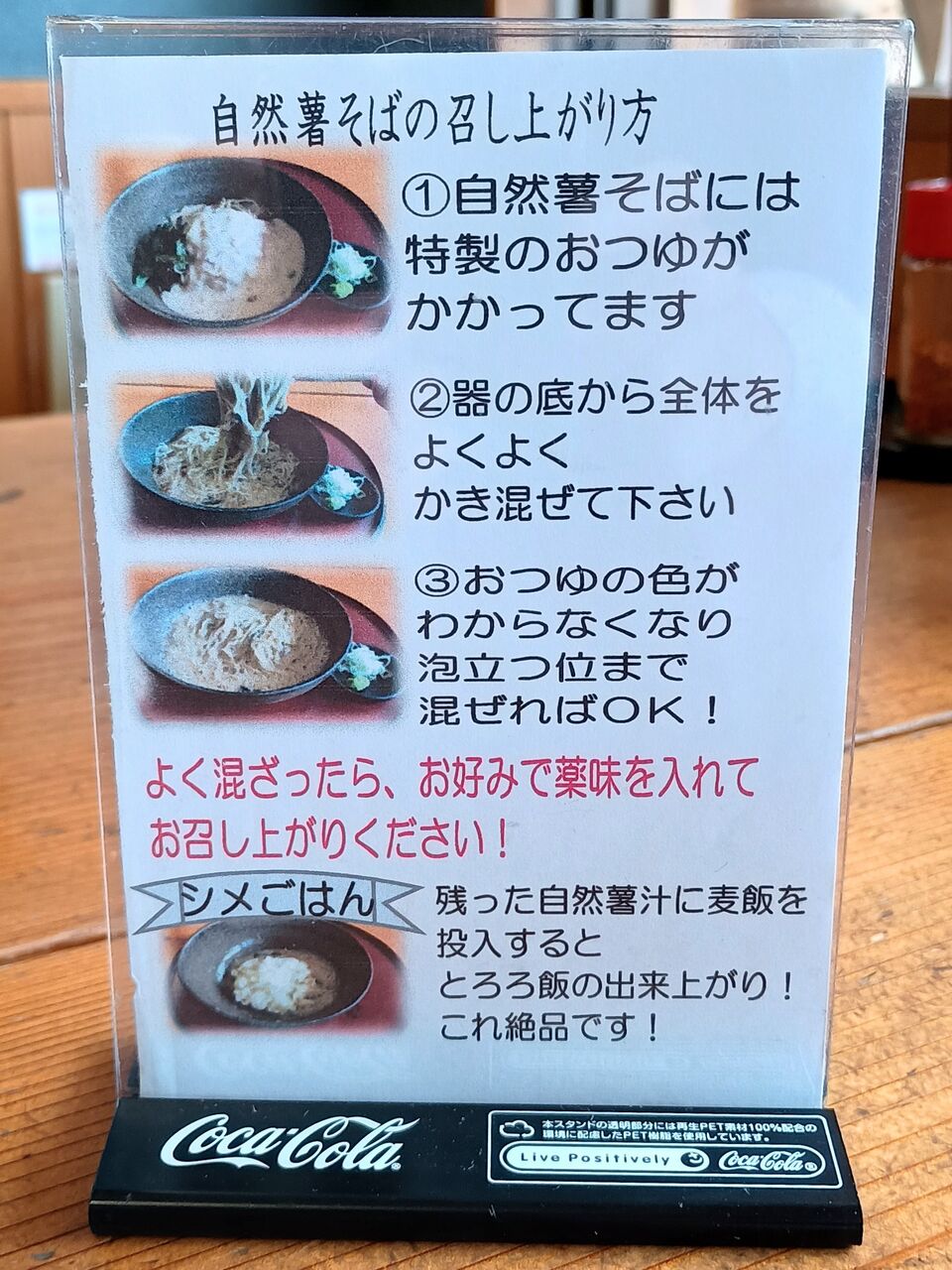 今回は『自然薯そば(温)』(写真左)を注文。定価1,480円を高尾山冬そばキャンペーンパンフレットのクーポン利用で1,380円。テーブルには自然薯そばの召し上がり方(写真右)が置いてありますが、かき混ぜ前にそばのコシやつゆの風味を楽しんでから混ぜるのも良いでしょう。