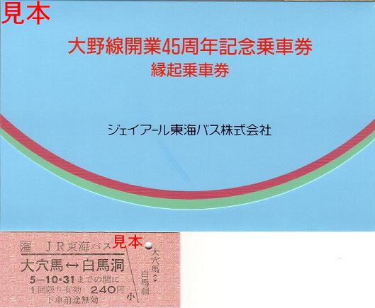 美濃白鳥〜九頭竜湖駅前間を結んでいたJR東海バス大野線(既に廃止)が存在していた頃に発売された、大野線開業45周年を記念した大穴馬←→白馬洞間の硬券乗車券です。台紙内側の説明文から平成5年8月発売のようです。