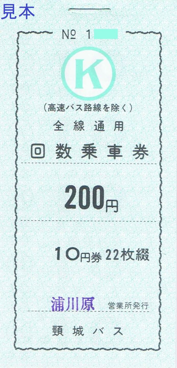 頸城自動車グループで訪問当時、最安の乗車券で10円券×22枚綴り=売価200円。写真はその表紙部分です。浦川原バスターミナルの東頸バス窓口で購入していますが頸城バスのものをそのまま使っています。なお、同日にイトーヨーカドー前、マルケーバスセンター、直江津駅前の各案内所で同じ券種のものを購入していますが、浦川原の券は『200円』や『10円券』の各数字の間隔が狭くなっています。