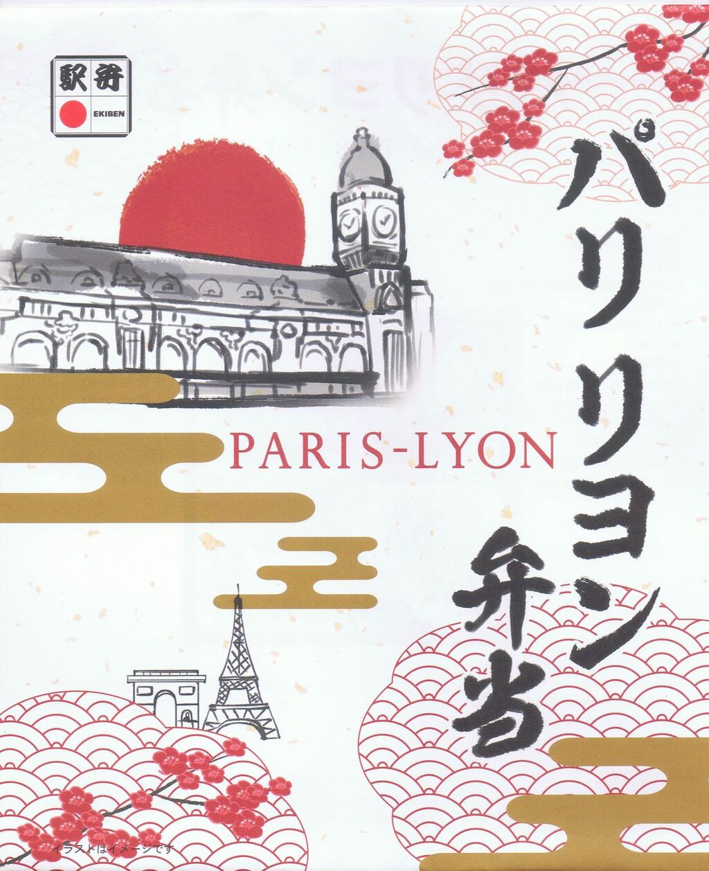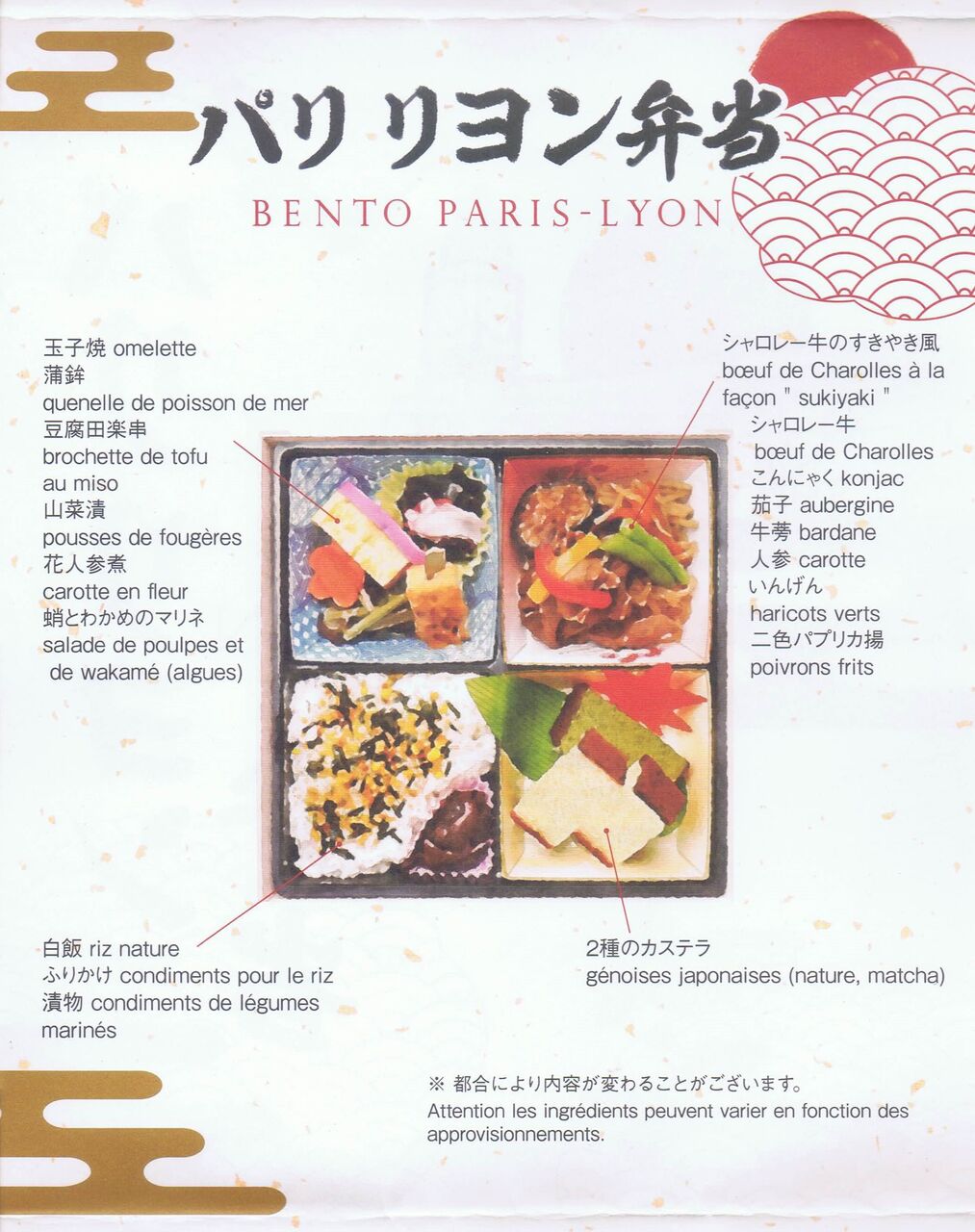 写真左は掛紙表面。写真右は掛紙内側に記載されたお品書き。パリ・リヨン駅で発売された駅弁の日本国内発売版で、フランス産のシャロレー牛を使用したすき焼きがメインの弁当。税込1,650円で、東京駅『駅弁屋祭』、新宿駅『駅弁屋頂』にて販売。