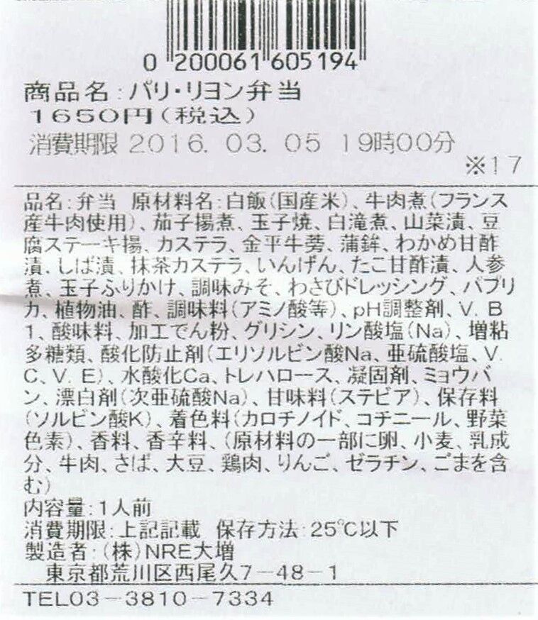 《NRE大増 パリリヨン弁当(2016年3〜4月発売)》