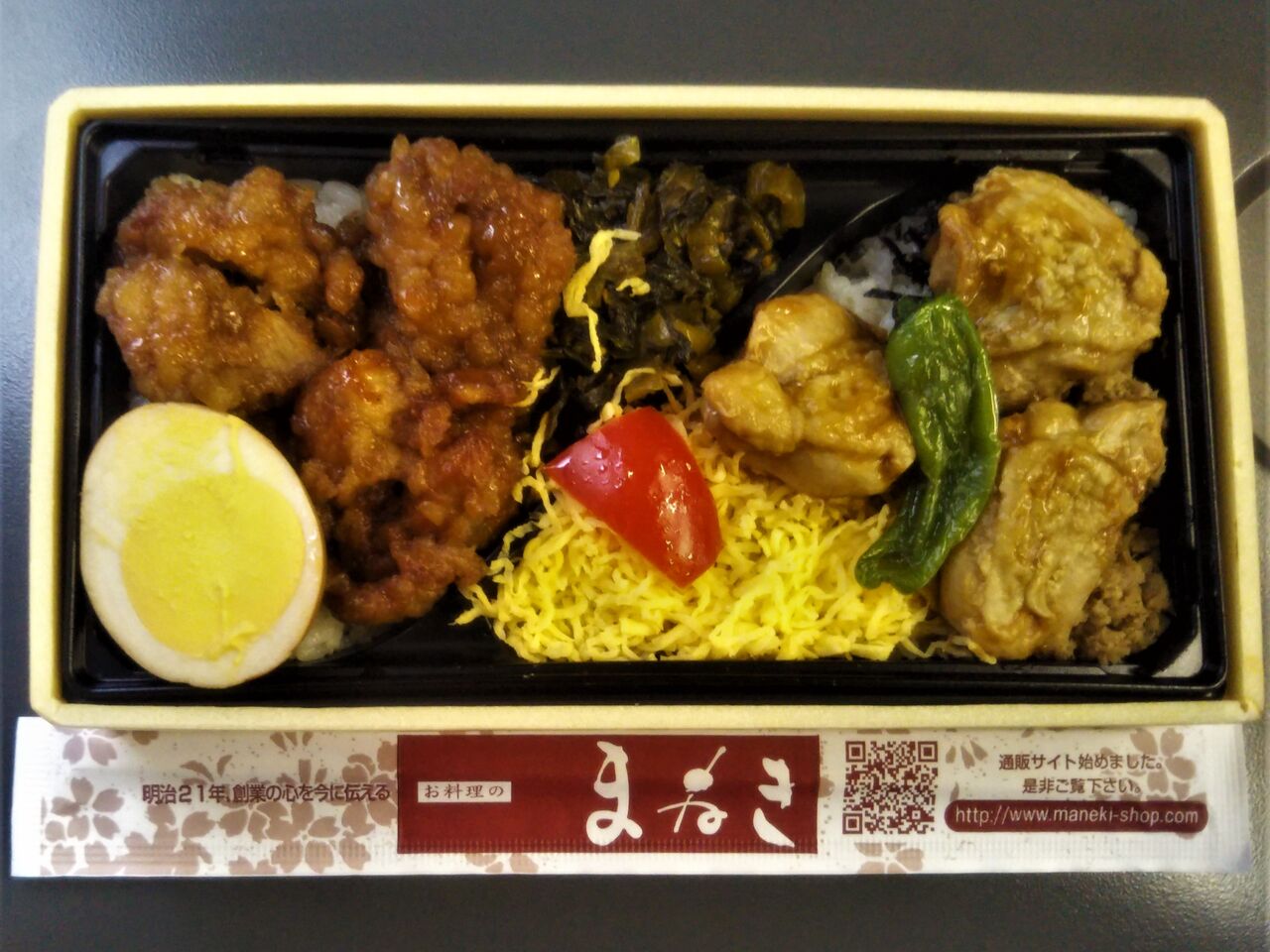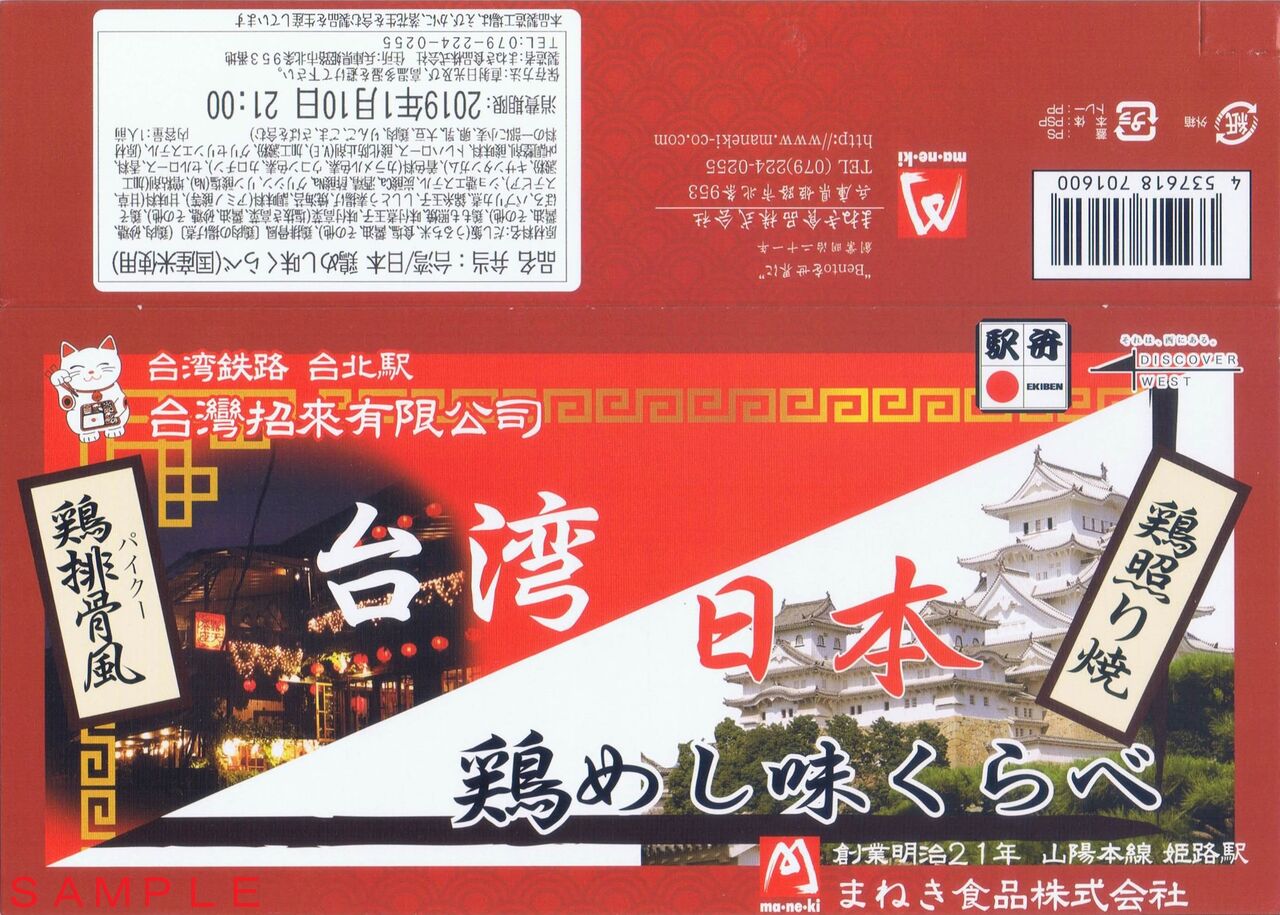 姫路駅の駅弁業者・まねき食品調製の駅弁で京王百貨店新宿店・第54回元祖有名駅弁と全国うまいもの大会の輸送駅弁コーナーにて購入。税込980円。まねき食品が2017年10月、台北駅に日本の駅弁業者として初の出店を行ったことから誕生したと思われる台湾(鶏排骨風)と日本(鶏照り焼)の味をひとつの駅弁にまとめた商品。