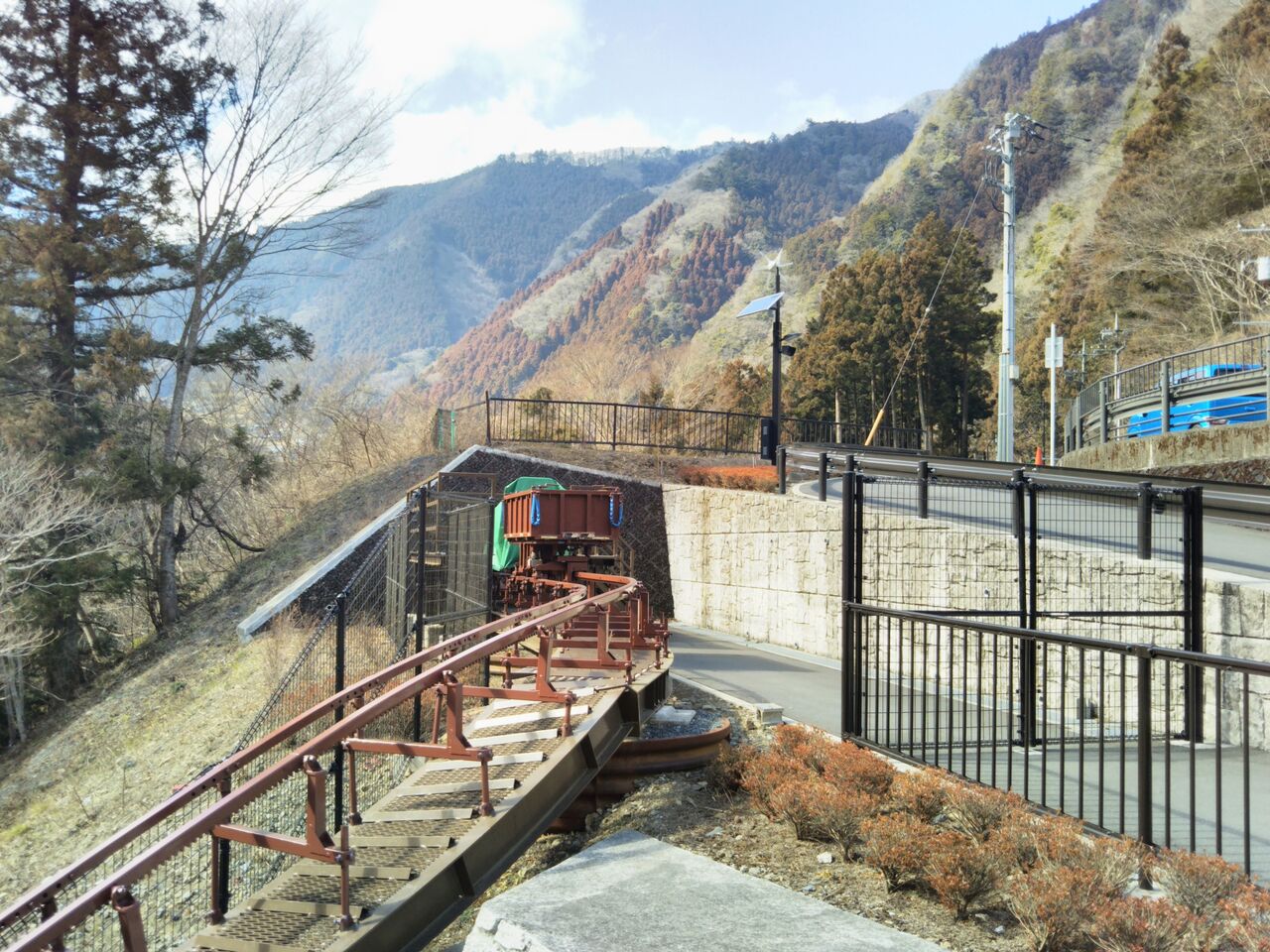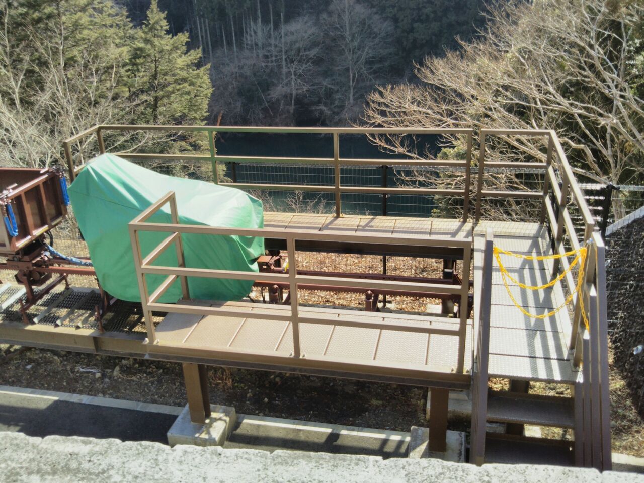 写真左は台車。写真右はその隣の車両で上部側終端部にて撮影。ビニールシートが被せられていますが動力が付いた本機の様です。