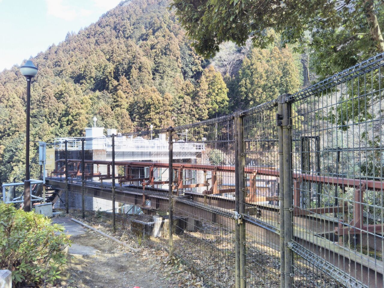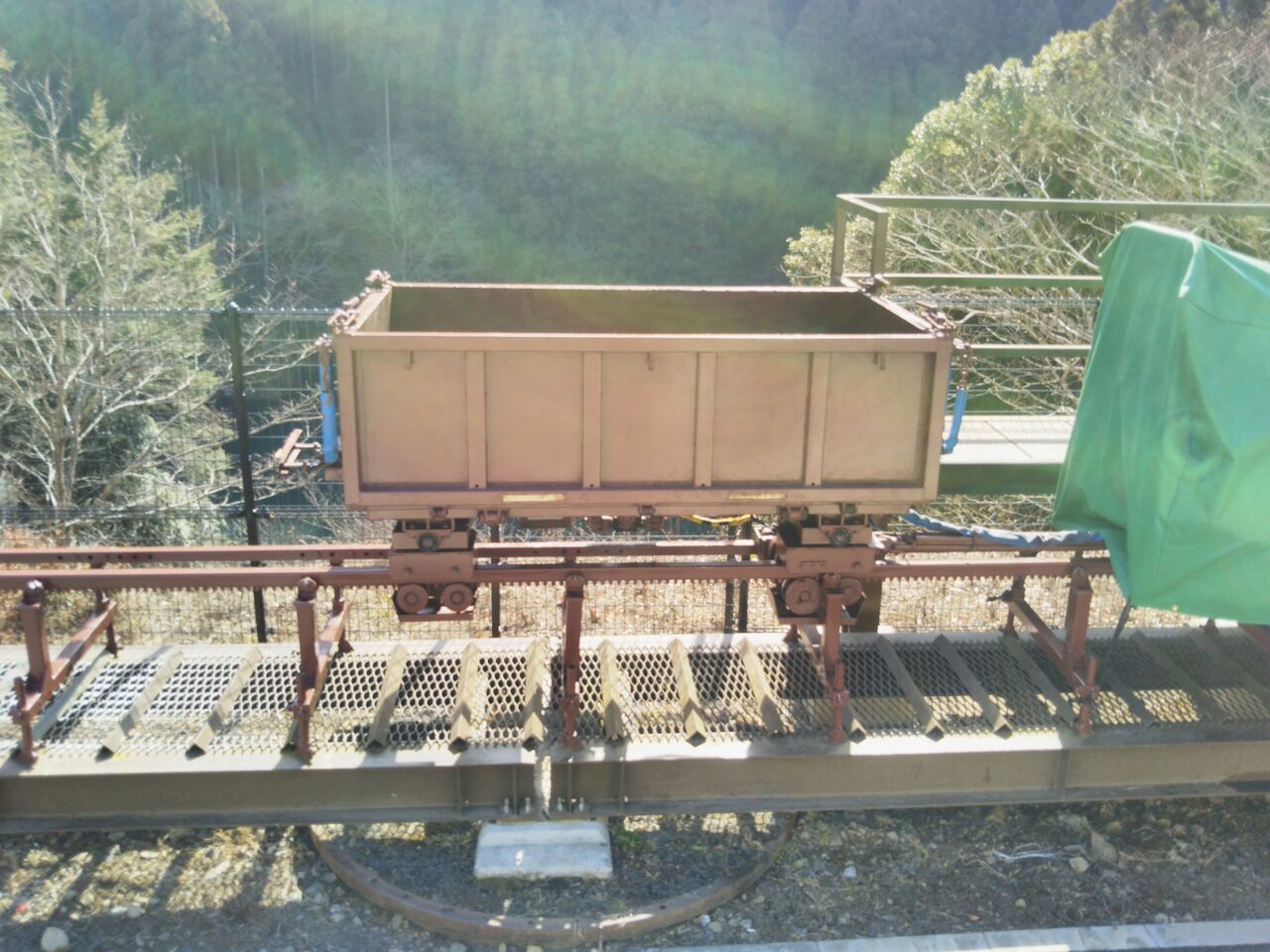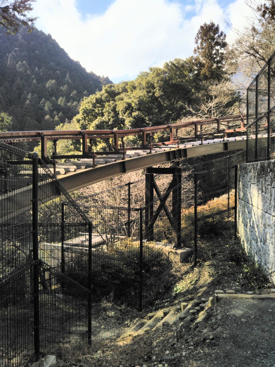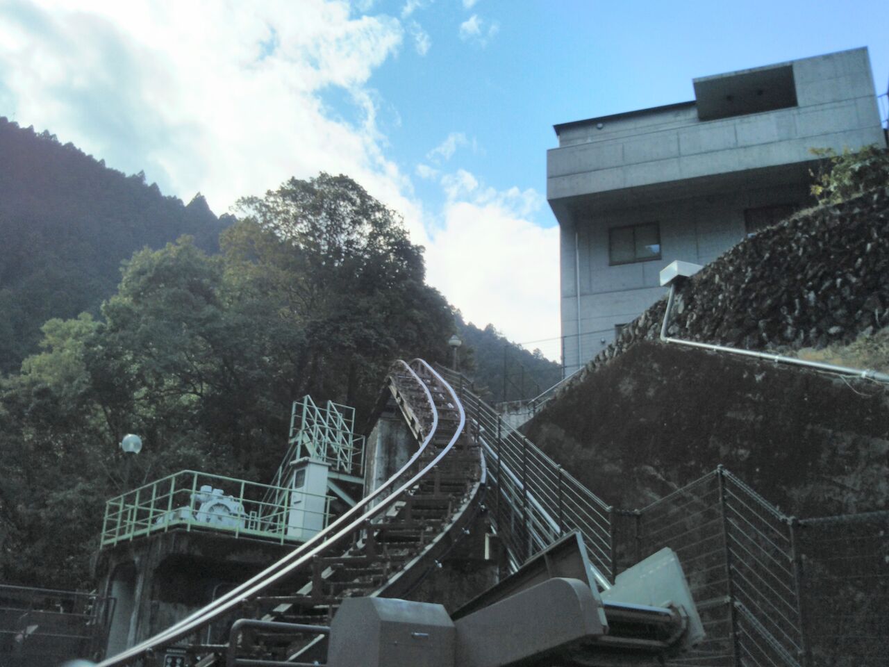 エコっと白丸に隣接したところに産業用モノレールを発見。京都市の内田産業製のようで、レールは2本ですが、同社の工事用モノレールの1種。施工実績のうち平成20年4月、機種名:DH-500、『白丸ダム搬出用設備及び取付道路ほか土木工事』時に納入されたもののようです。