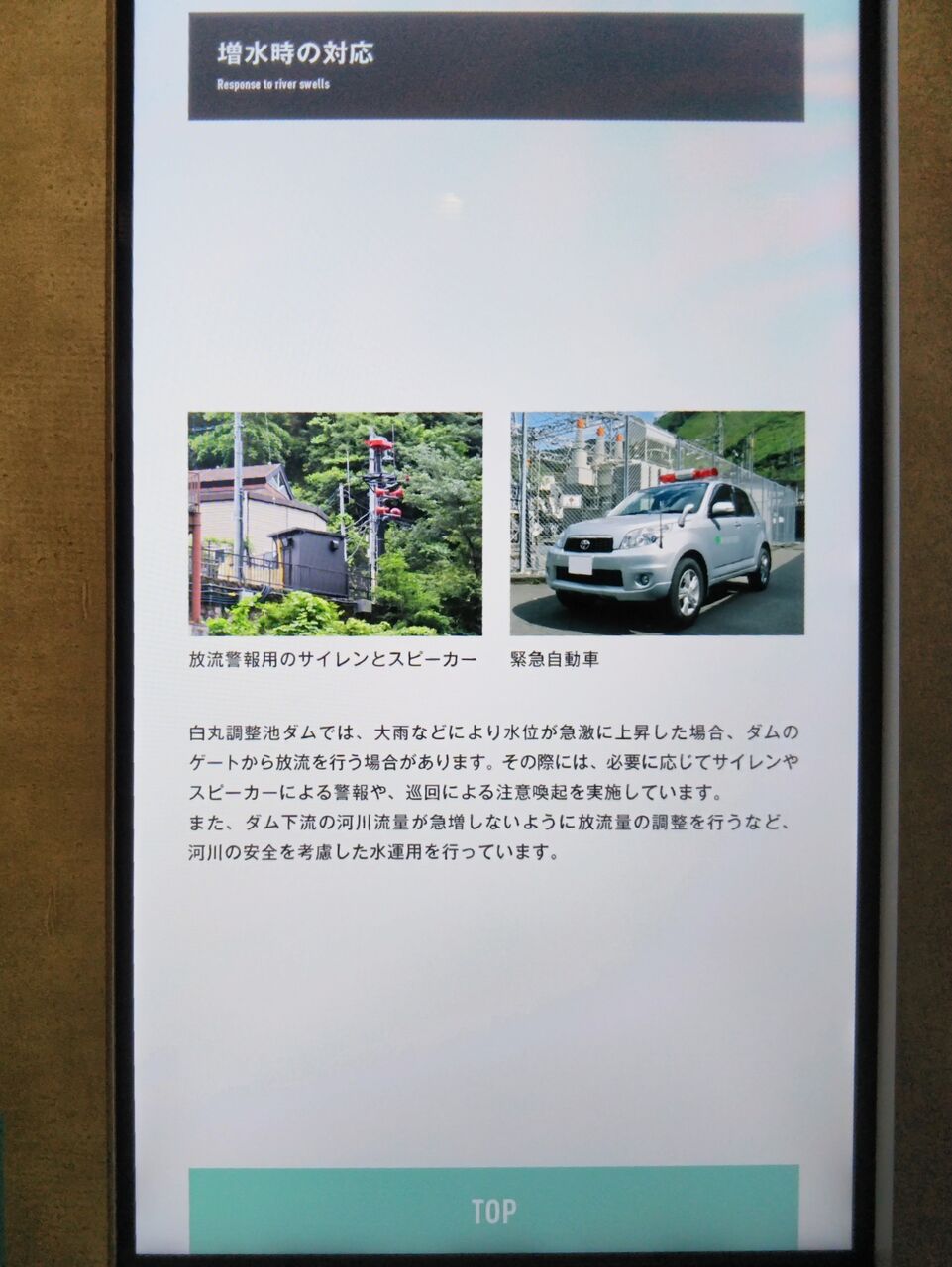 エコっと白丸館内のデジタルサイネージによる『増水時の対応』に『緊急自動車』という乗り物を発見。訪問日には実物を見ることは出来ませんでした。