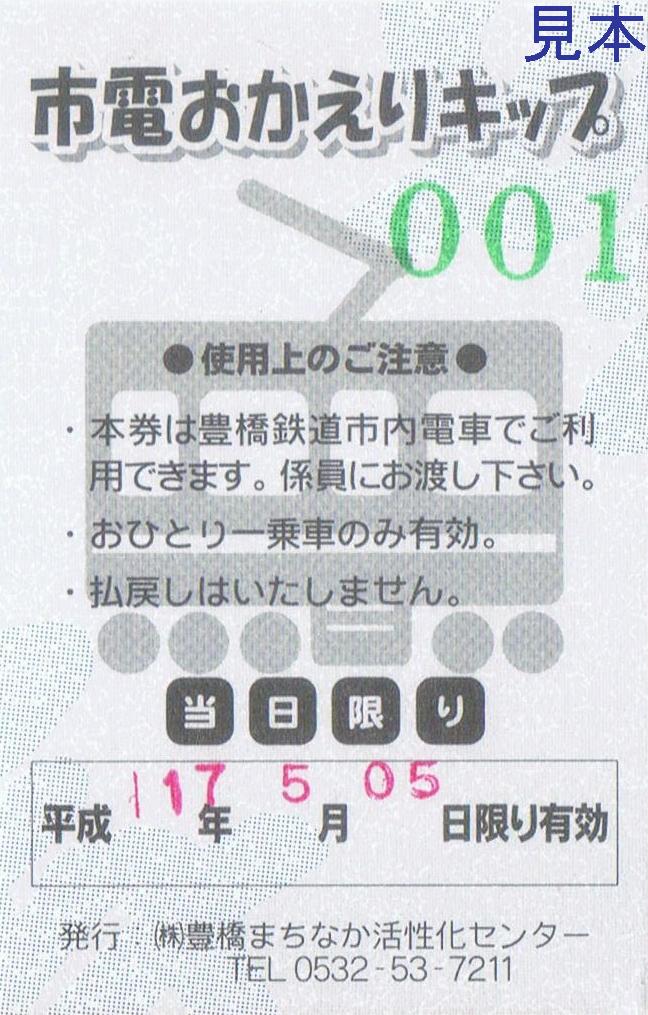 株式会社豊橋まちなか活性化センターは、豊橋市、豊橋商工会議所などが出資する第三セクターです。事業内容は都市開発や商業施設の企画やコンサルティング業務など『まちづくり』に関するもので、鉄道関連では豊橋鉄道東田本線駅前大通停留所の開業にあわせて2005(平成17)年3月より来街促進事業の一環として『市電おかえりキップサービス事業』を開始しています。これは加盟店で一定金額以上の購入者の復路が無料となる乗車券『市電おかえりキップ』を配布するものです。