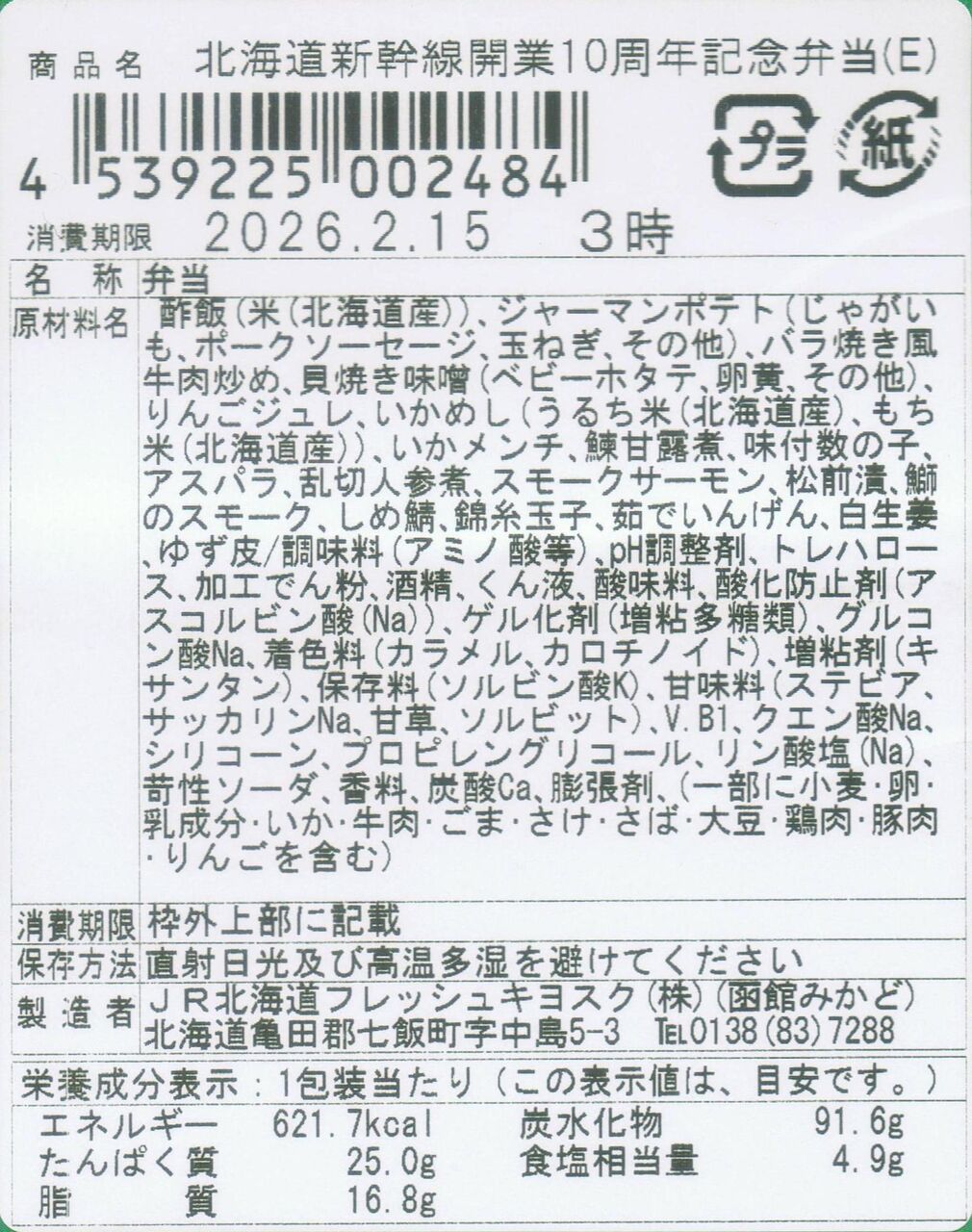 2026年5月頃までの予定で発売中の記念駅弁で税込1,980円。製造者はJR北海道グループで函館駅弁業者でもあるJR北海道フレッシュキオスク(函館みかど)。なお、掛紙はJR北海道H5系とJR東日本E5系の2種類ありました(中身・お品書は同じ)。写真左は掛紙で先述の団体専用臨時列車にも使用されたE5系。写真右はE5系バージョンのラベルで商品名の右側に『(E)』と印字されています。東京駅構内の駅弁屋祭グランスタ東京店にて収集。
