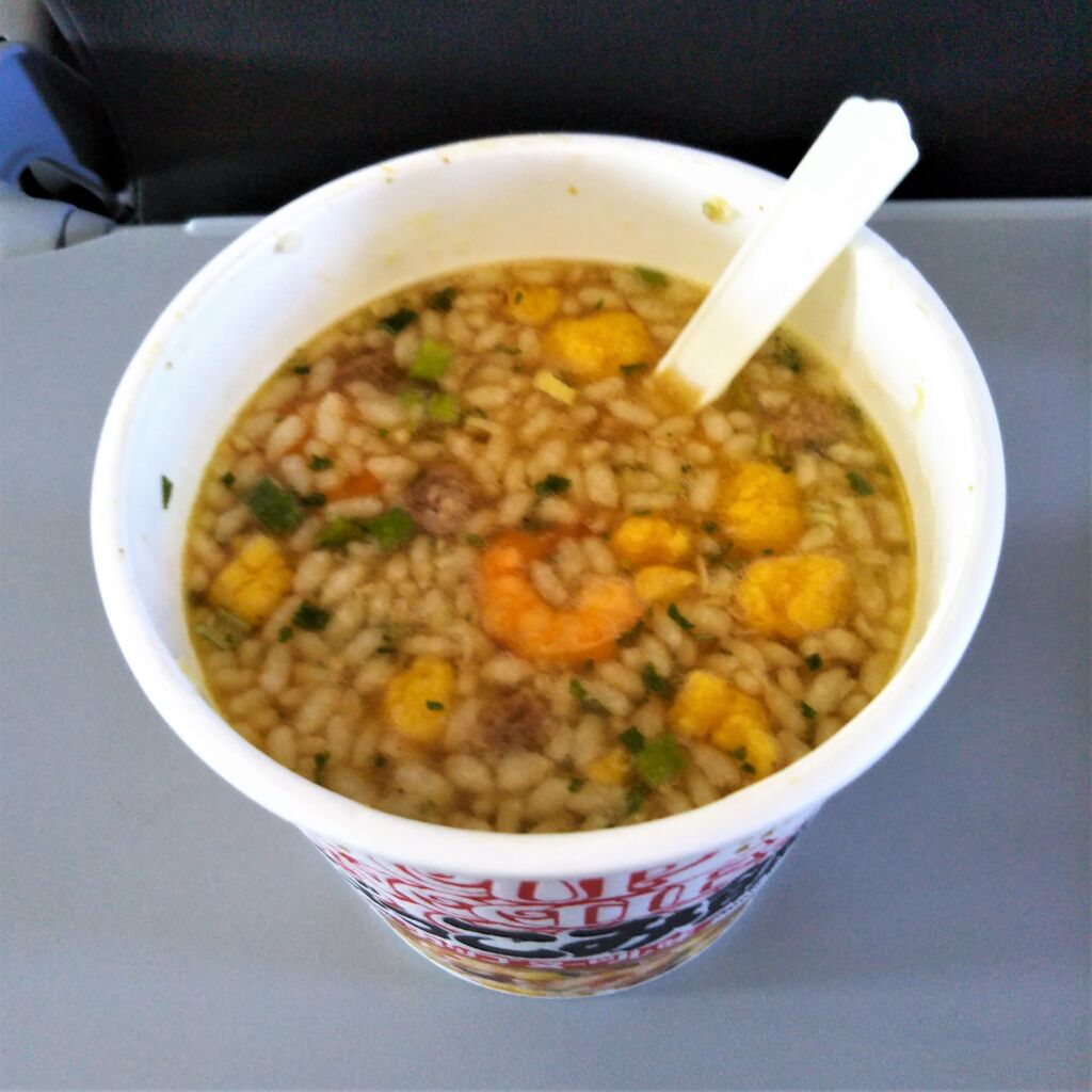 残念ながら搭乗した便では『ジェッ太』デザインの『ジェットスターオリジナルなごみどら焼』(税込400円)の取り扱いは無く、カレー等の軽食(事前予約制)の事前予約を行っていなかったため、当日でも注文できるご飯ものという事で『カップヌードル ぶっこみ飯』(税込500円)を注文。特に市販のものとの違いはなし。付属するナプキンは無地のもので特別感はありません。しかし、最近の鉄道では観光列車や一部の新幹線、近鉄特急、東武特急を除いてどんどん車内販売を廃止していますが、この様な商品でも販売してくれているだけ何も無いよりかは遥かにマシ。値段はちょっと高めですが、有り難いくらいです。======================================
