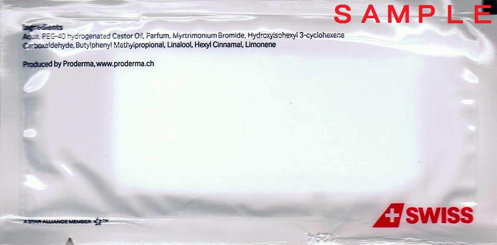 先述のプレミアムコーヒー+チョコのセットに付いてきたスイスインターナショナルエアラインズのおしぼり(写真左は表面、写真右は裏面)。