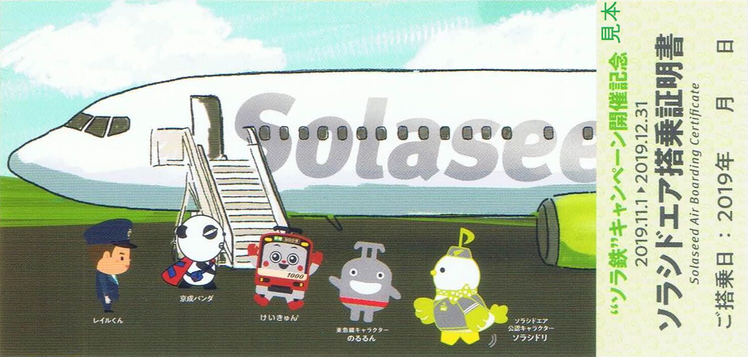 ソラシドエアは2019年11月1日〜12月31日にソラシドエアと鉄道の旅『“ソラ鉄”キャンペーン』第二弾を実施しました。関東の私鉄(東急電鉄、京成電鉄、西武鉄道、京浜急行電鉄)とタイアップし、私鉄側ではソラ鉄お散歩きっぷの発売、ソラシドエア側では機内誌で各私鉄沿線の紹介、ソラ鉄ジェットの運航、ソラ鉄コラボ搭乗証明書の配布等が行われました。