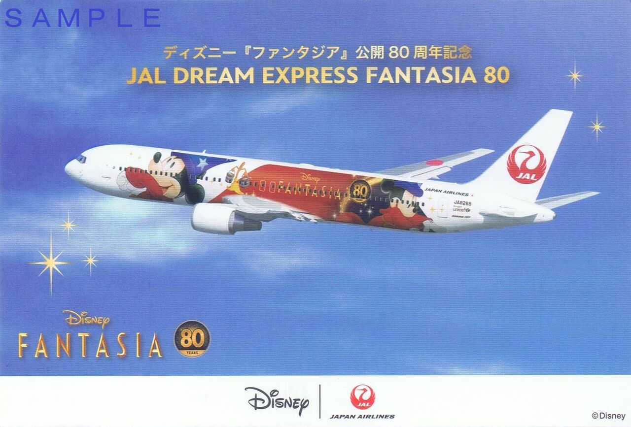ディズニー映画『ファンタジア』の公開80周年を記念して2020年(令和2年)11月18日〜2022年(令和4年)3月ごろまでJAL国内線にて運航予定の特別デザイン機『JAL DREAM EXPRESS FANTASIA 80(JAL ドリームエクスプレス ファンタジア 80)』関連のポストカード。当該機材以外の国内線でも配布しています。主な就航路線は東京(羽田)−大阪(伊丹)線、東京(羽田)−福岡線、東京(羽田)−札幌(新千歳)線、東京(羽田)−沖縄(那覇)線です。