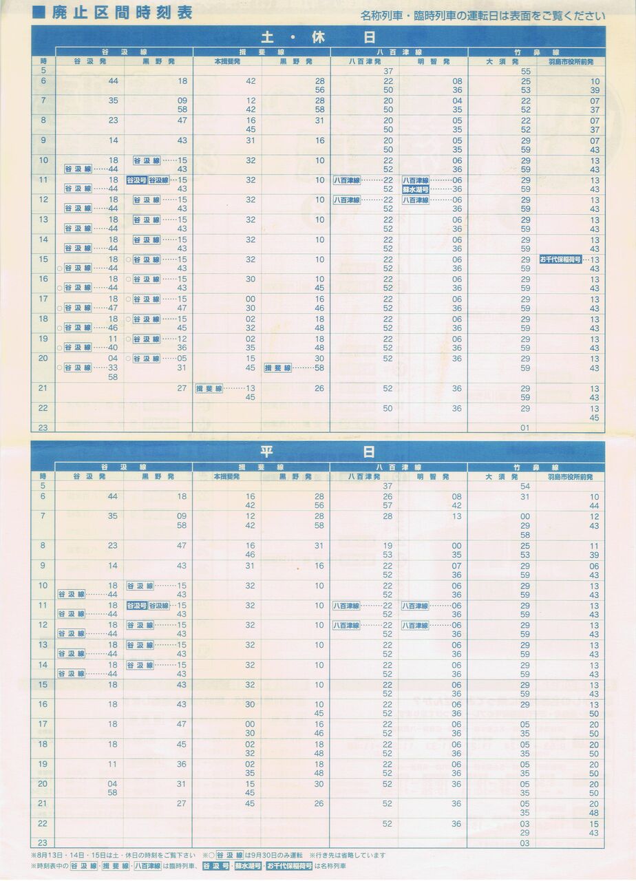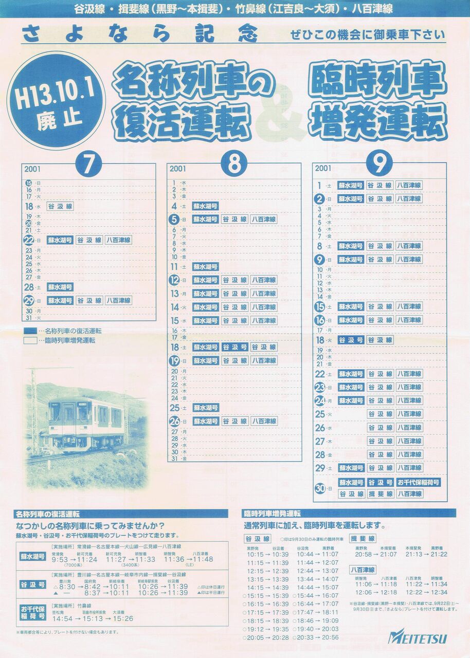 平成13年10月1日の名鉄谷汲線・揖斐線(黒野〜本揖斐)・竹鼻線(江吉良〜大須)・八百津線の廃止前に運行された名称列車、臨時列車リーフレットの表面と裏面です。蘇水胡号と谷汲号については名古屋本線経由の列車とリレー方式で運行されました。