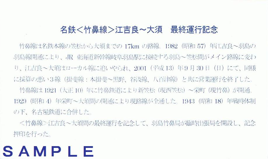 《名鉄竹鼻線江吉良~大須最終運行記念カバー(平成13年)》
