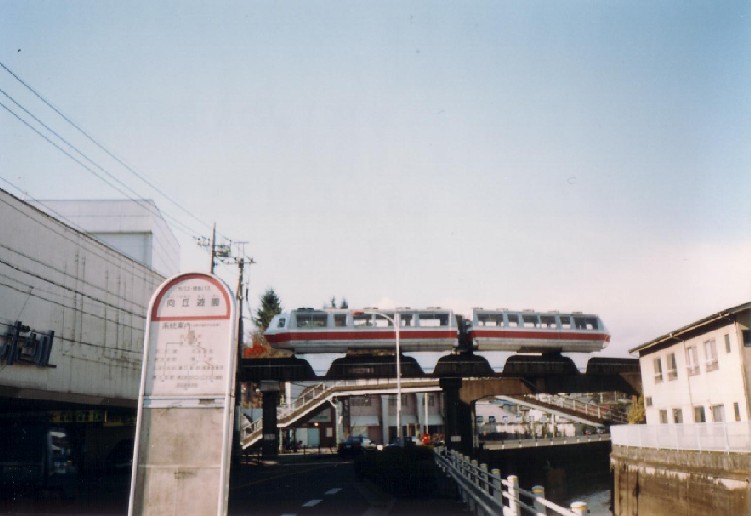 自分の手元に残っていた唯一のモノレール車両の写真ですが、矢ノ口線・梶ヶ谷線のバス停のポールがメインになっているようで、今思えばとても残念。平成6年の長期運休最終日の試運転時に向ヶ丘遊園モノレール線向ヶ丘遊園正門駅付近で撮影したものです。