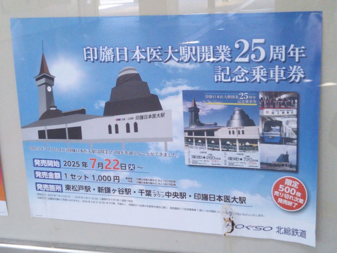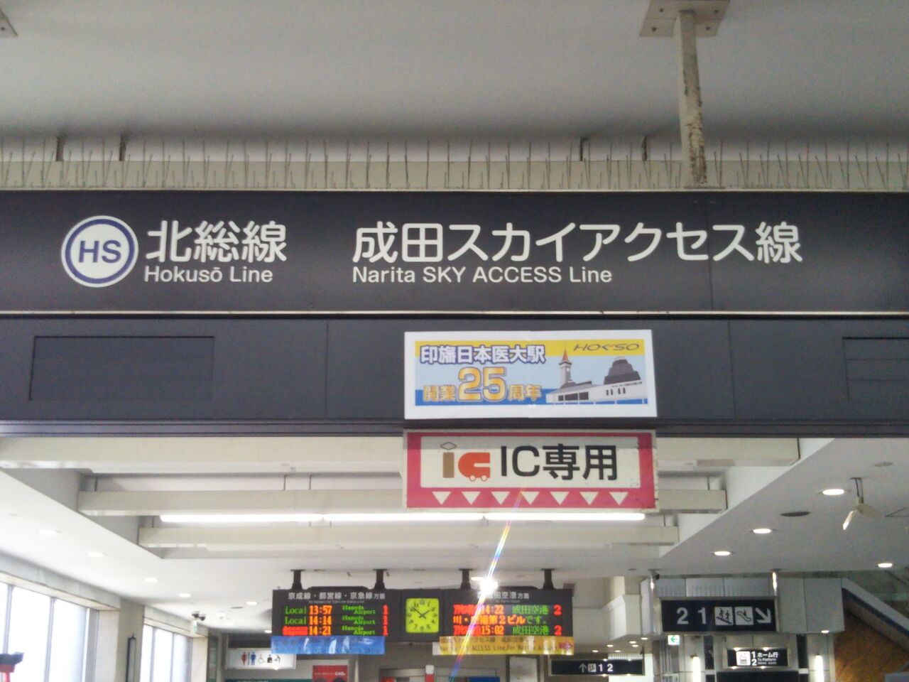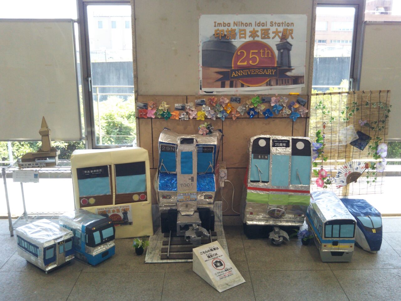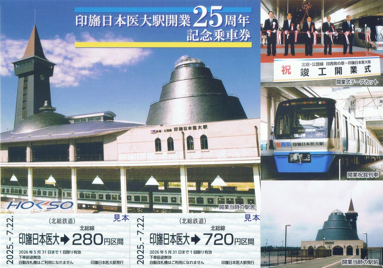 改札内には25周年記念の展示物があり、北総鉄道以外に京成電鉄、新京成電鉄、住宅・都市整備公団→都市基盤整備公団、千葉ニュータウン鉄道の車両があります。《印旛日本医大駅開業25周年記念ヘッドマーク車両》