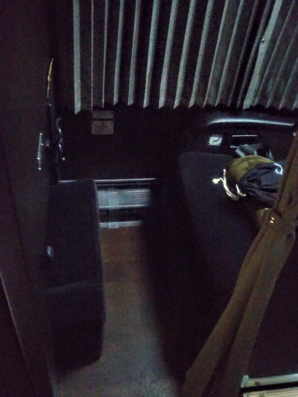 通路から見たプレシャスクラスです。パーテーション付きで通路入口部分はカーテンで仕切る半個室型で、JRバスでは最上級の座席となります。東京〜大阪府間で運行される夜行高速バスでは、南海電気鉄道系の和歌山バスが運行するサウスウェーブ号(海浜幕張駅〜TDL〜京成上野〜横浜駅〜堺駅〜和歌山市駅)の前方2席・プレミアムシートがこれに近い半個室タイプです(後方は3列シート。また、和歌山バスの大半の便と、共同運行の成田空港交通の全便は全席3列シート)。両備バス・関東バスが運行するドリームスリーパー東京大阪号(池袋駅西口〜新宿駅西口〜大阪駅前〜門真車庫)は全席完全個室で構成されています。