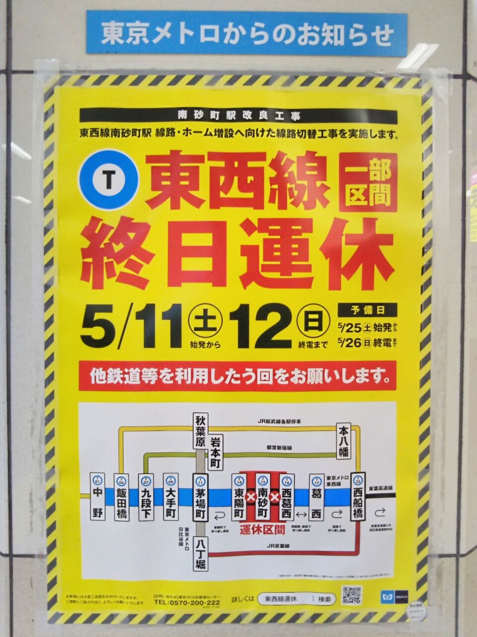 東京地下鉄(東京メトロ)東西線東陽町〜西葛西間は、南砂町駅改良工事に伴い2024年(令和6年)5月11・12日の予定で終日運休となります。運休区間については代行バスが運行されますが、それに関しては積極的に案内しておらず、並行するJR東日本総武線・京葉線、都営新宿線の振替輸送がメインの代替交通機関となります。