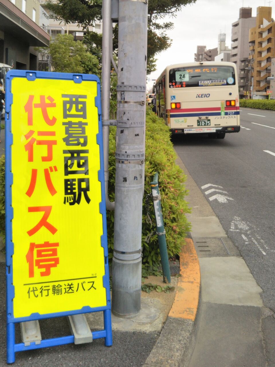 写真右は代行バスの乗車場辺りで、江戸川区球場付近の清砂大橋通り上です。西葛西駅南口を出て、南側に歩き、西葛西6丁目第三交差点を渡って右側。駅から約300mと距離があります。