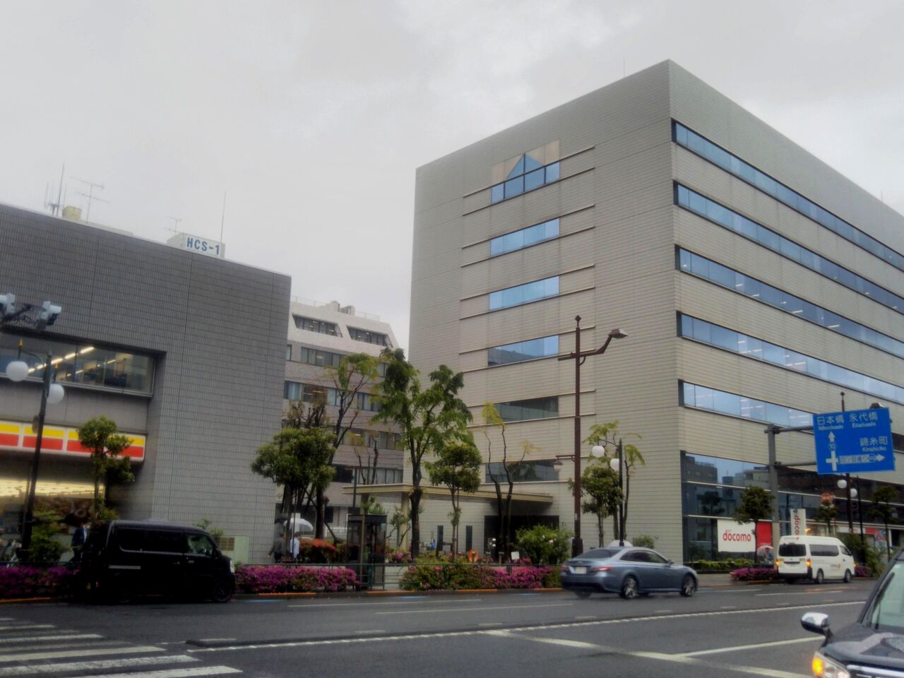 写真右は代行バスの乗車場で、ドコモショップ東陽町店が入居する佐藤ダイヤビルディングの駐車場出入口付近です。東西線5番出入口を出て、左側の横断歩道を渡ったところ。