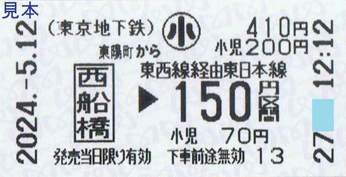 東陽町駅券売機にて購入した西船橋駅からJR線への連絡乗車券。