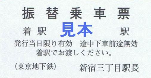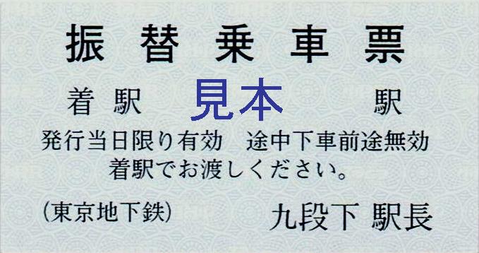 九段下のものは2024年(令和6年)5月12日、東西線南砂町駅改良工事(東陽町〜西葛西間運休)に伴う振替輸送時に発行されたもの。但し、今回の振替輸送においては他社鉄道線利用の振替輸送は無券での対応。積極的に既存路線バスへの振替案内はしておらず、路線バス利用を希望する客に『言われたら配布する』という対応のし方でした。※2011年10月08日掲載(御茶ノ水、新御茶ノ水、新宿、新宿三丁目)
