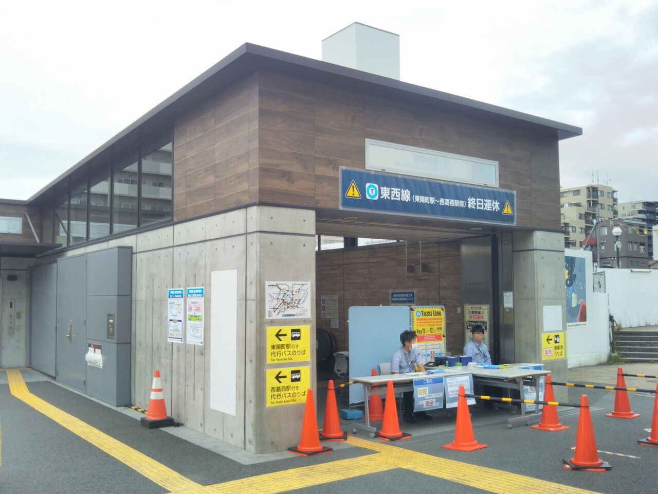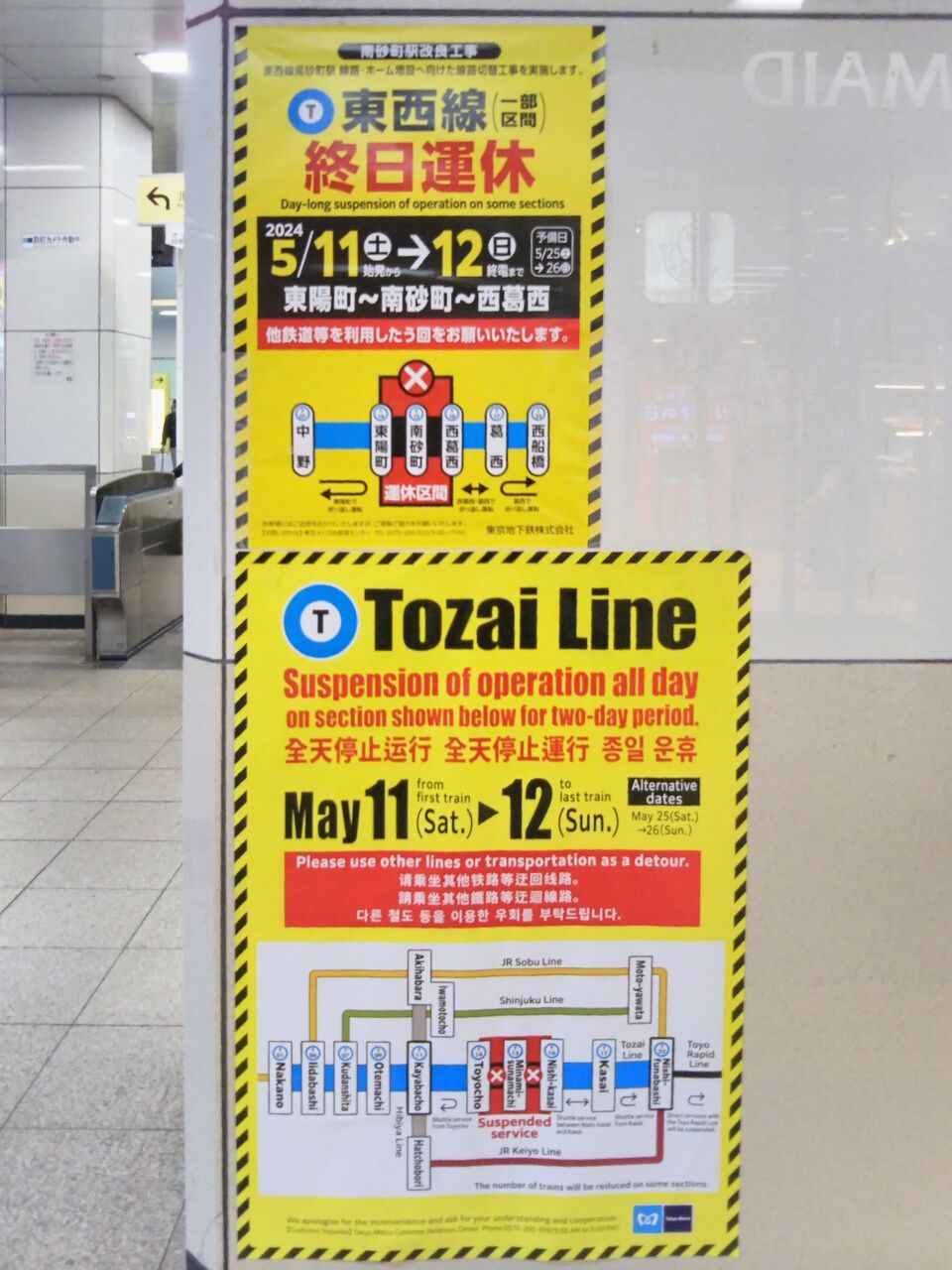 写真左は東陽町駅に掲示されていた東西線一部区間運休及び代行バスに関する掲示物。