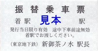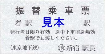 東京地下鉄の振替乗車票です。地紋の色は、営団時代には黄緑色でしたが、改組後は青色となっています。