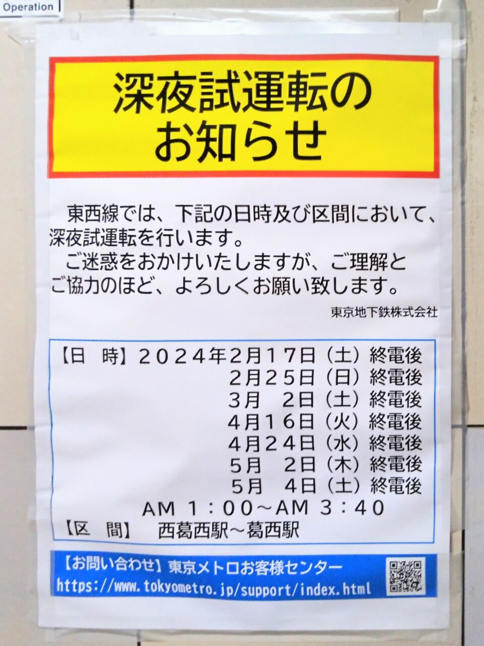 西葛西駅〜葛西駅間の深夜試運転のお知らせ。運休当日の同区間単線運転のために実施。