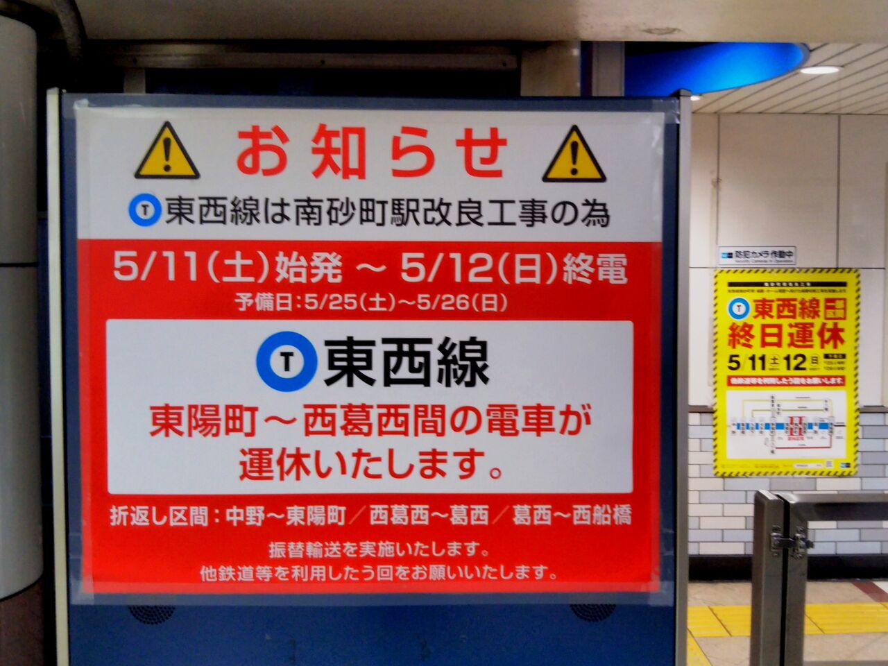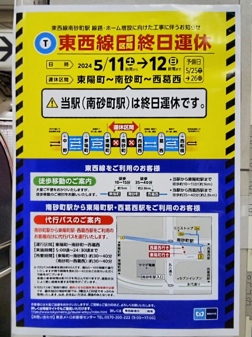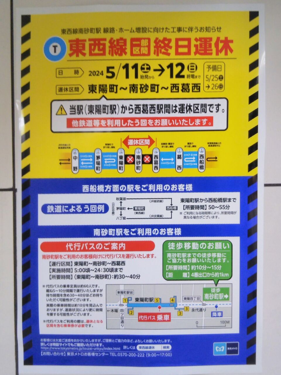 写真は南砂町駅に掲示されていた東西線一部区間運休及び代行バスに関する掲示物。