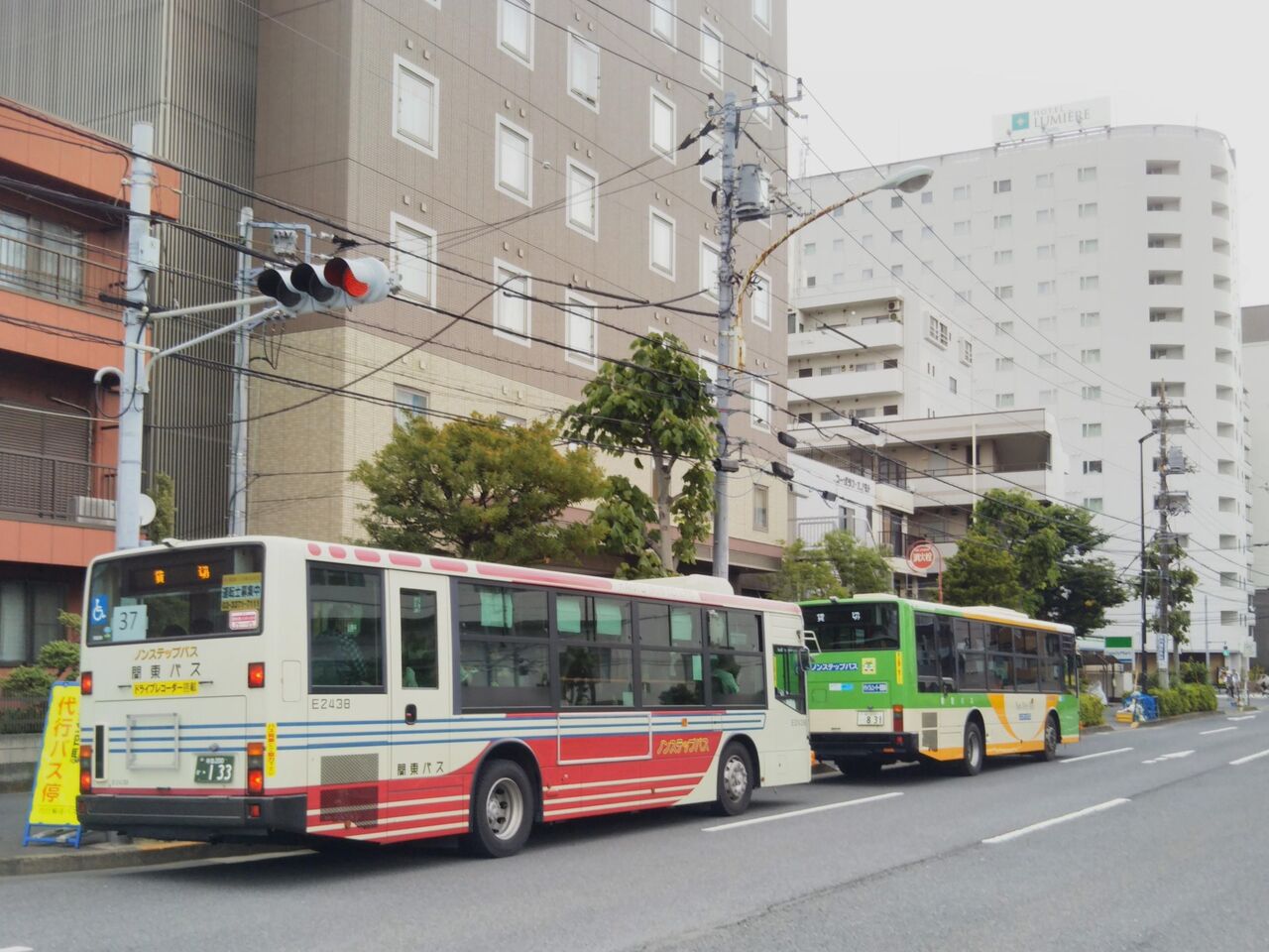 関東バス担当便。写真左は南砂町駅乗降場、右は西葛西駅降車場にて撮影。